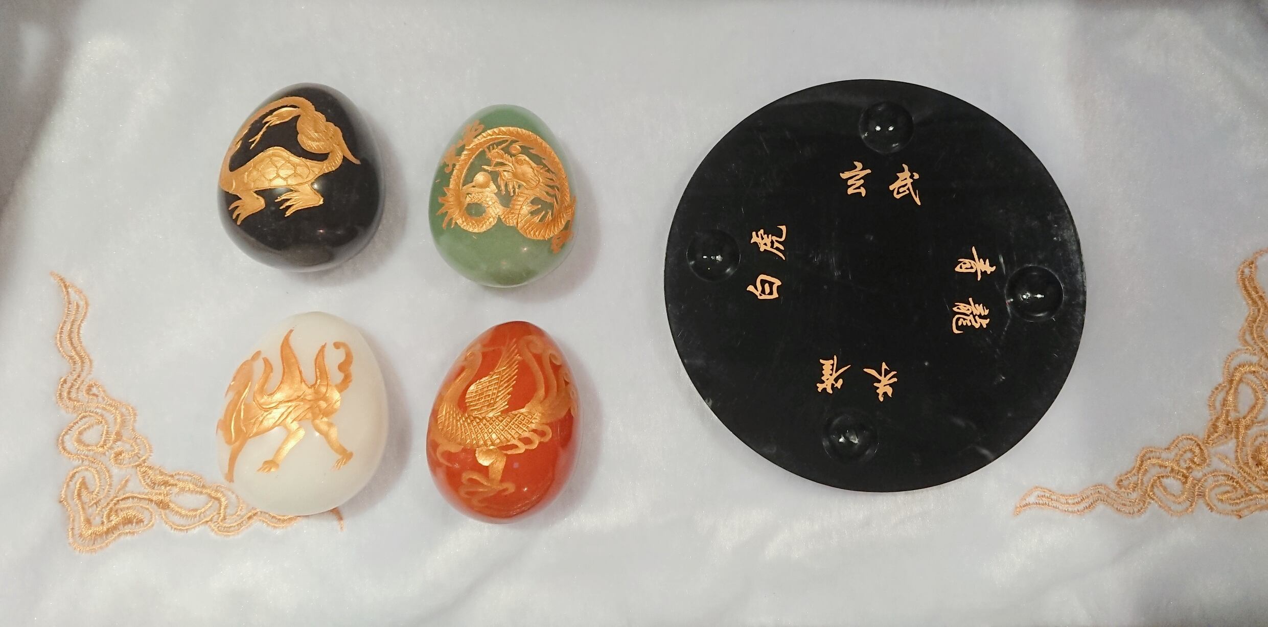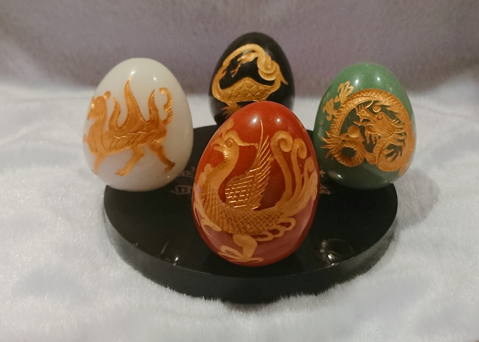 「たまご」に、風水四神獣の姿をしっかりと彫り込みました。石は全て天然です。