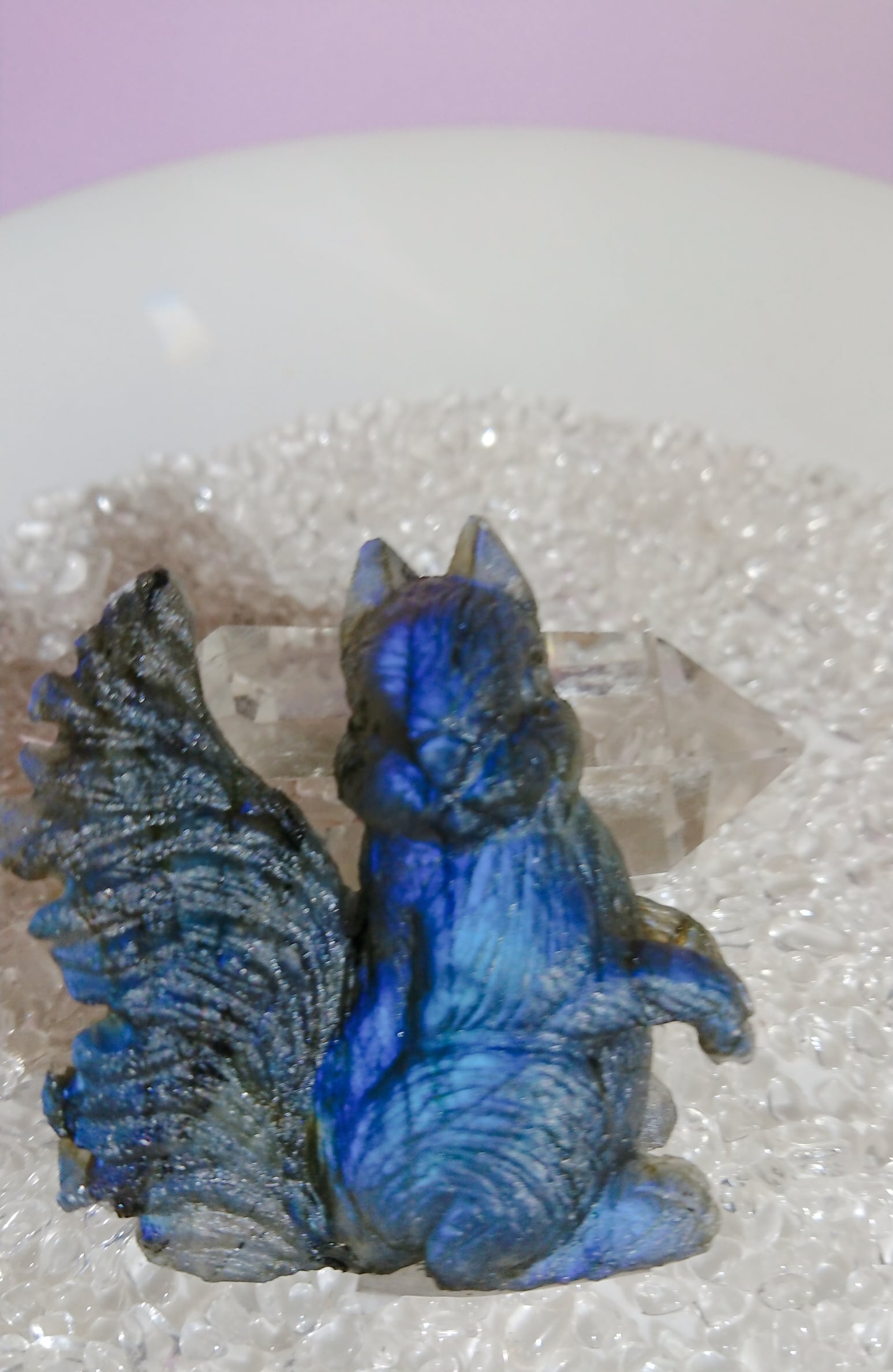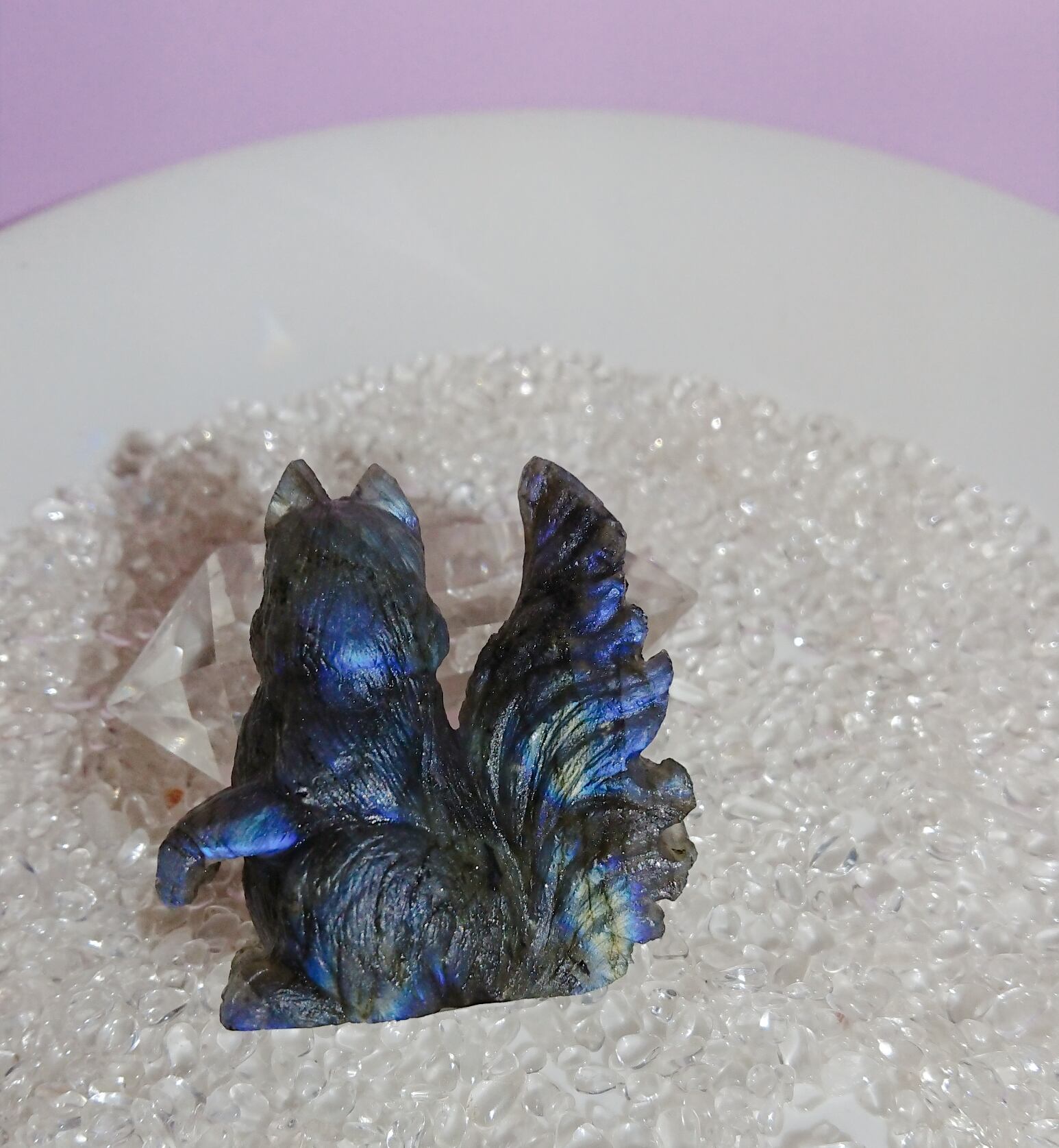 ラブラドライトのシラー効果が見事なリスの彫刻置物です。