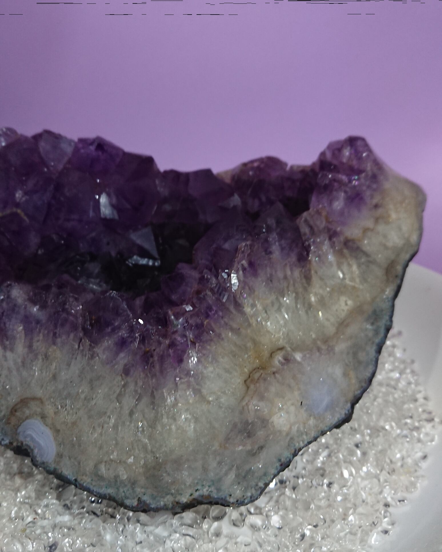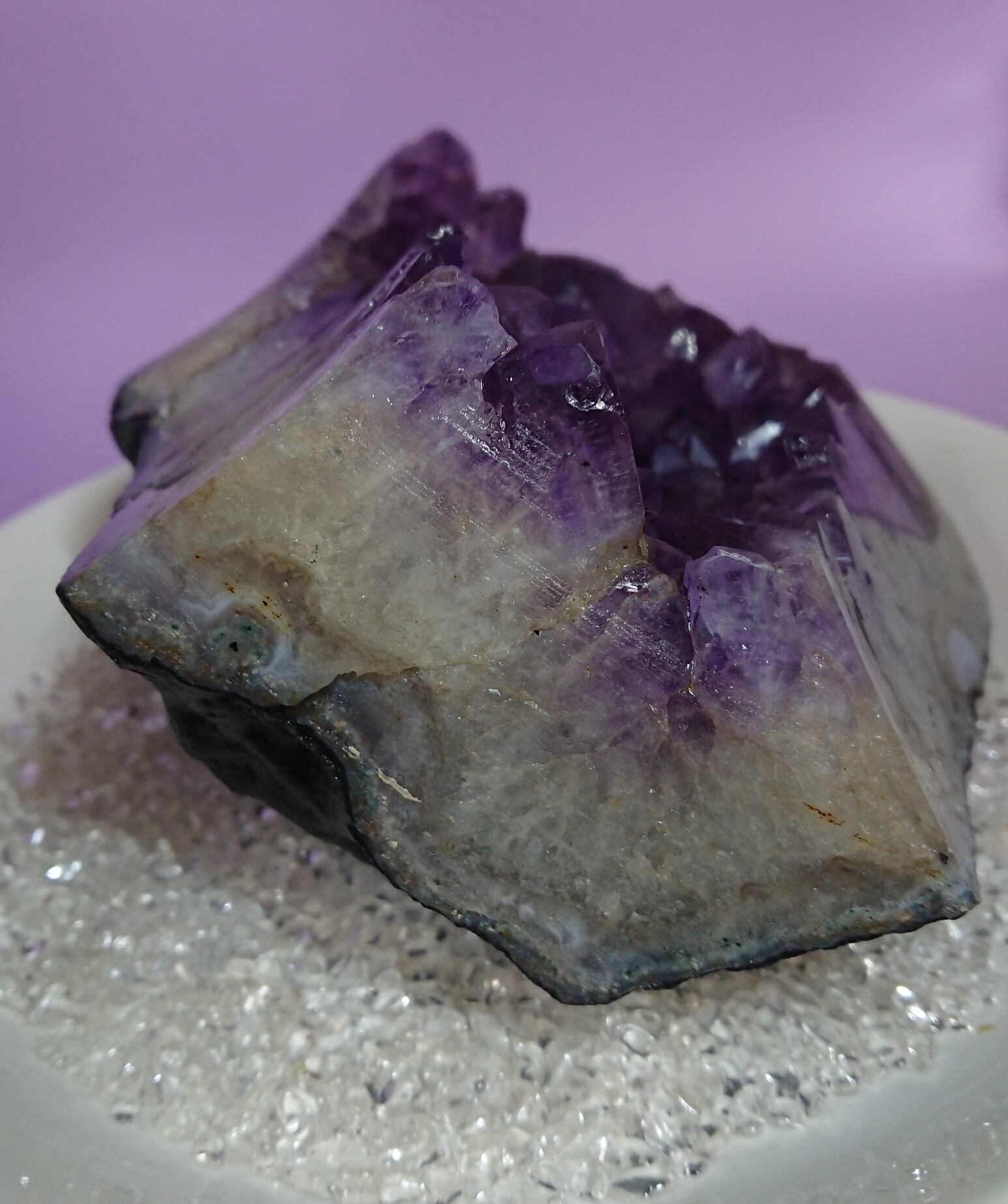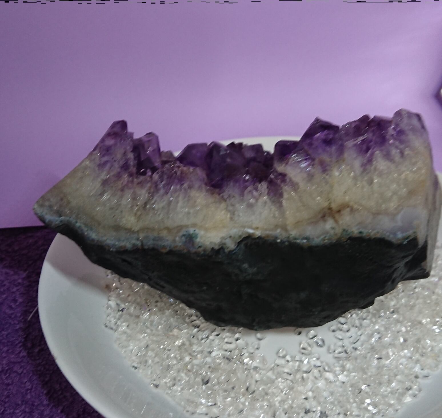 似た形状のものにアメジストドームがありますが、ドームは内側にアメジストの結晶が付いたものを言い、クラスターは外向きに結晶が付いているものをいいます。