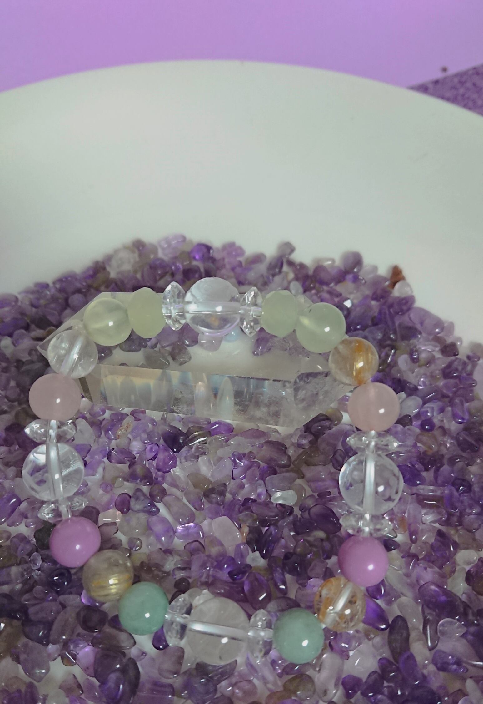 すべてのものを浄化し、生命力を活性化させ、潜在能力を引き出し、直感力、創造力をはぐくむなど、石の中でも万能的な存在です。あらゆるもの・こと・人に対応するとされ、古来より魔よけや、お守り、呪術に使用されてきました。増幅のパワーをもつとされ、エネルギーを高めてくれるといわれています。潜在的な能力の目覚めを促し、人格を高めてくれるでしょう。精神的な成長を願うときに身につけると、霊性に磨きをかけてくれるはずです。周囲の状況に惑わされず、冷静に物事を見極め、困難に打ち克つ力が欲しいときにもよいでしょう。今までのパターンから抜け出して、ステージアップできるといわれています。無色透明の水晶は、さまざまな雑念を取り去り、集中力を高める効果があるといいます。達成したい夢や目標があるときは、願いを込めて身につけることをおすすめします。強力な浄化のパワーを秘めた水晶は、ヒーリングとパワーアップの効果をあわせもつ万能パワーストーンです。持ち主を成長させるとされるため、状況がよくなるまで身につけてみてください。あらゆるエネルギーを高め、お守りとして心身を守ってくれるでしょう。水晶は組み合わせた他のパワーストーンの個性を引き出し、その能力を十分に発揮させるといわれています。すべての石の浄化を助け、清浄に保たせてくれるでしょう。