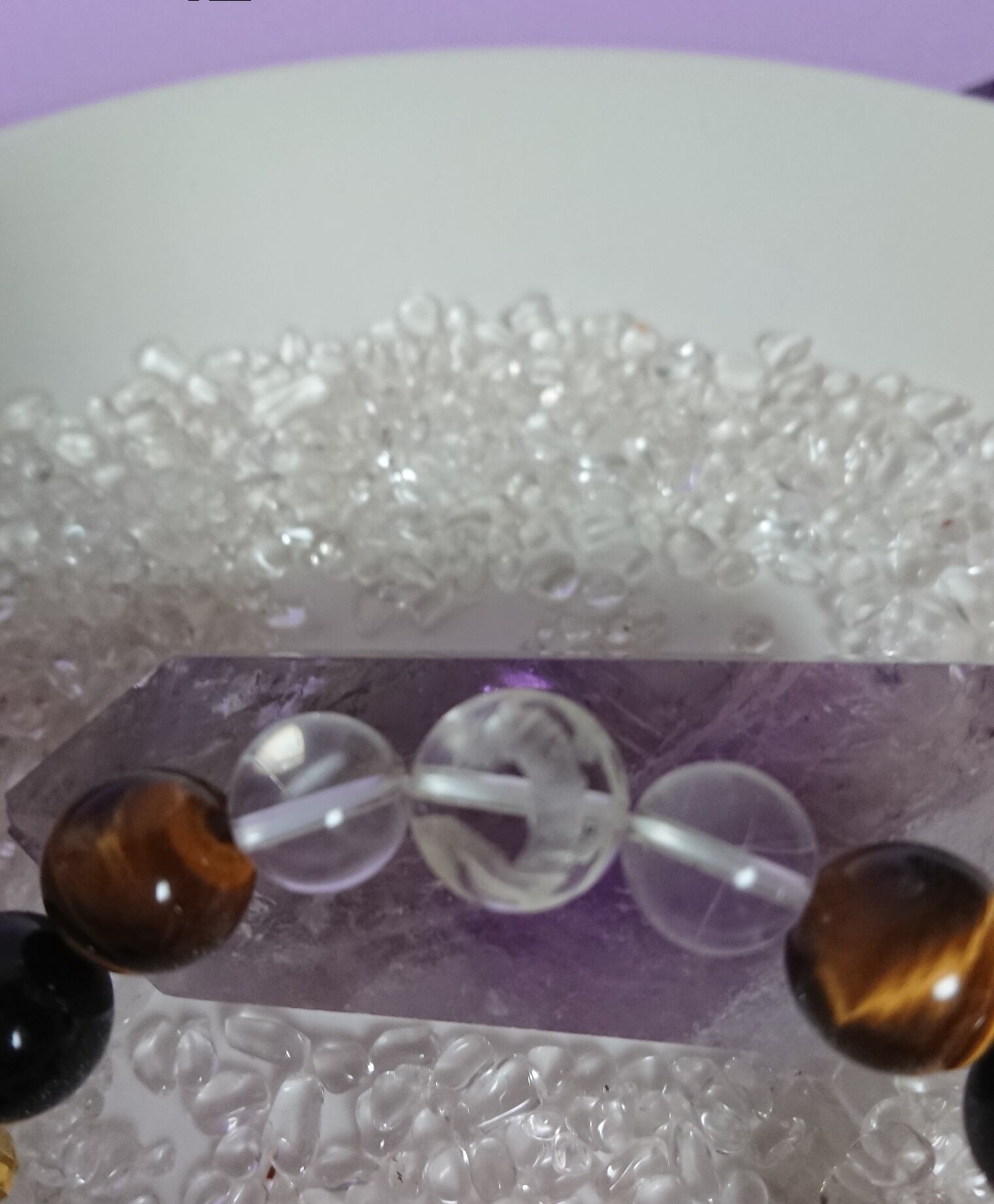 すべてのものを浄化し、生命力を活性化させ、潜在能力を引き出し、直感力、創造力をはぐくむなど、石の中でも万能的な存在です。あらゆるもの・こと・人に対応するとされ、古来より魔よけや、お守り、呪術に使用されてきました。増幅のパワーをもつとされ、エネルギーを高めてくれるといわれています。潜在的な能力の目覚めを促し、人格を高めてくれるでしょう。精神的な成長を願うときに身につけると、霊性に磨きをかけてくれるはずです。周囲の状況に惑わされず、冷静に物事を見極め、困難に打ち克つ力が欲しいときにもよいでしょう。今までのパターンから抜け出して、ステージアップできるといわれています。無色透明の水晶は、さまざまな雑念を取り去り、集中力を高める効果があるといいます。達成したい夢や目標があるときは、願いを込めて身につけることをおすすめします。強力な浄化のパワーを秘めた水晶は、ヒーリングとパワーアップの効果をあわせもつ万能パワーストーンです。持ち主を成長させるとされるため、状況がよくなるまで身につけてみてください。あらゆるエネルギーを高め、お守りとして心身を守ってくれるでしょう。水晶は組み合わせた他のパワーストーンの個性を引き出し、その能力を十分に発揮させるといわれています。すべての石の浄化を助け、清浄に保たせてくれるでしょう。