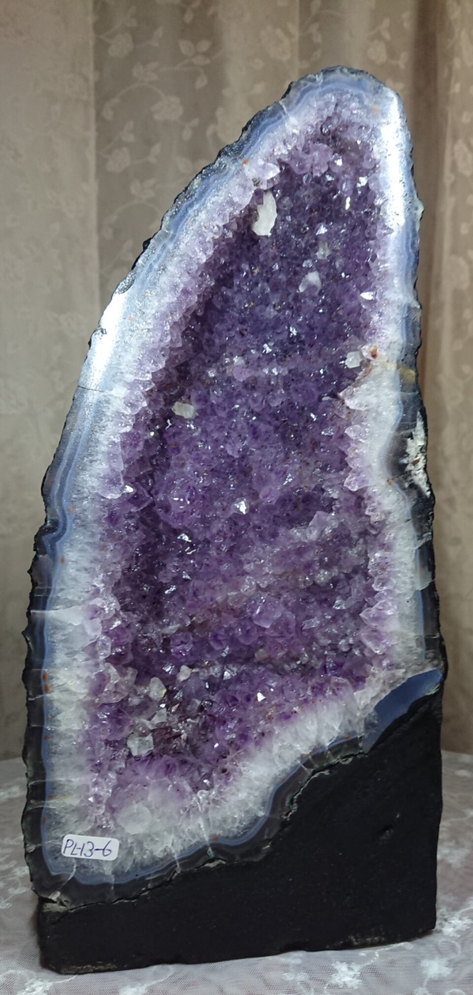 水晶は通常岩石の上に生成されますが、地層や岩の内側に洞窟状にできたものをアメジストドームといいます。アメジストの原石を半分に割り断面を美しく研磨すると、迫力と存在感、そしてエネルギーに満ちた置物に仕上がるのです。