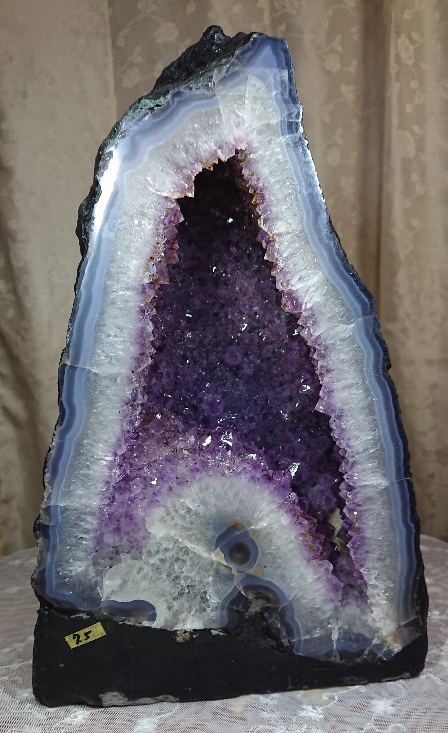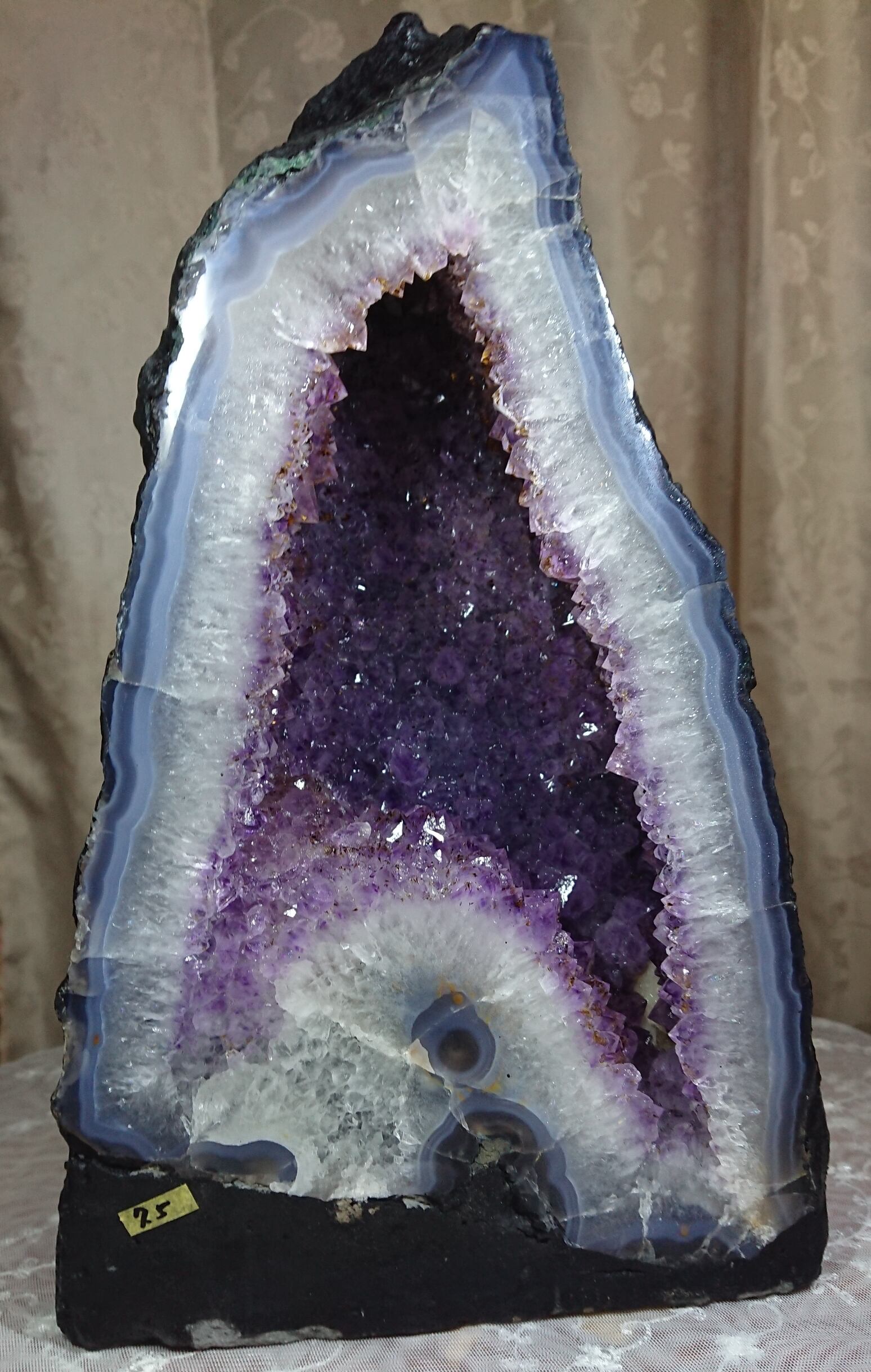 水晶は通常岩石の上に生成されますが、地層や岩の内側に洞窟状にできたものをアメジストドームといいます。アメジストの原石を半分に割り断面を美しく研磨すると、迫力と存在感、そしてエネルギーに満ちた置物に仕上がるのです。