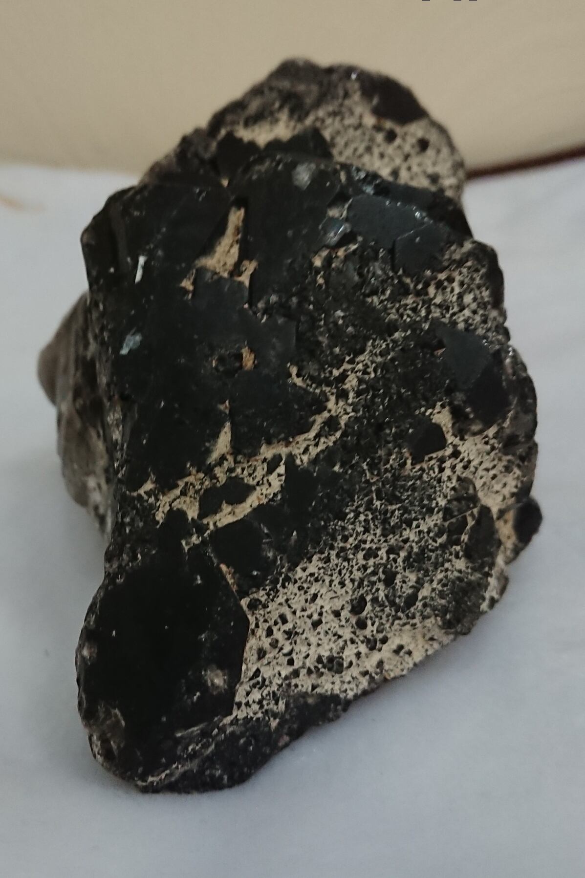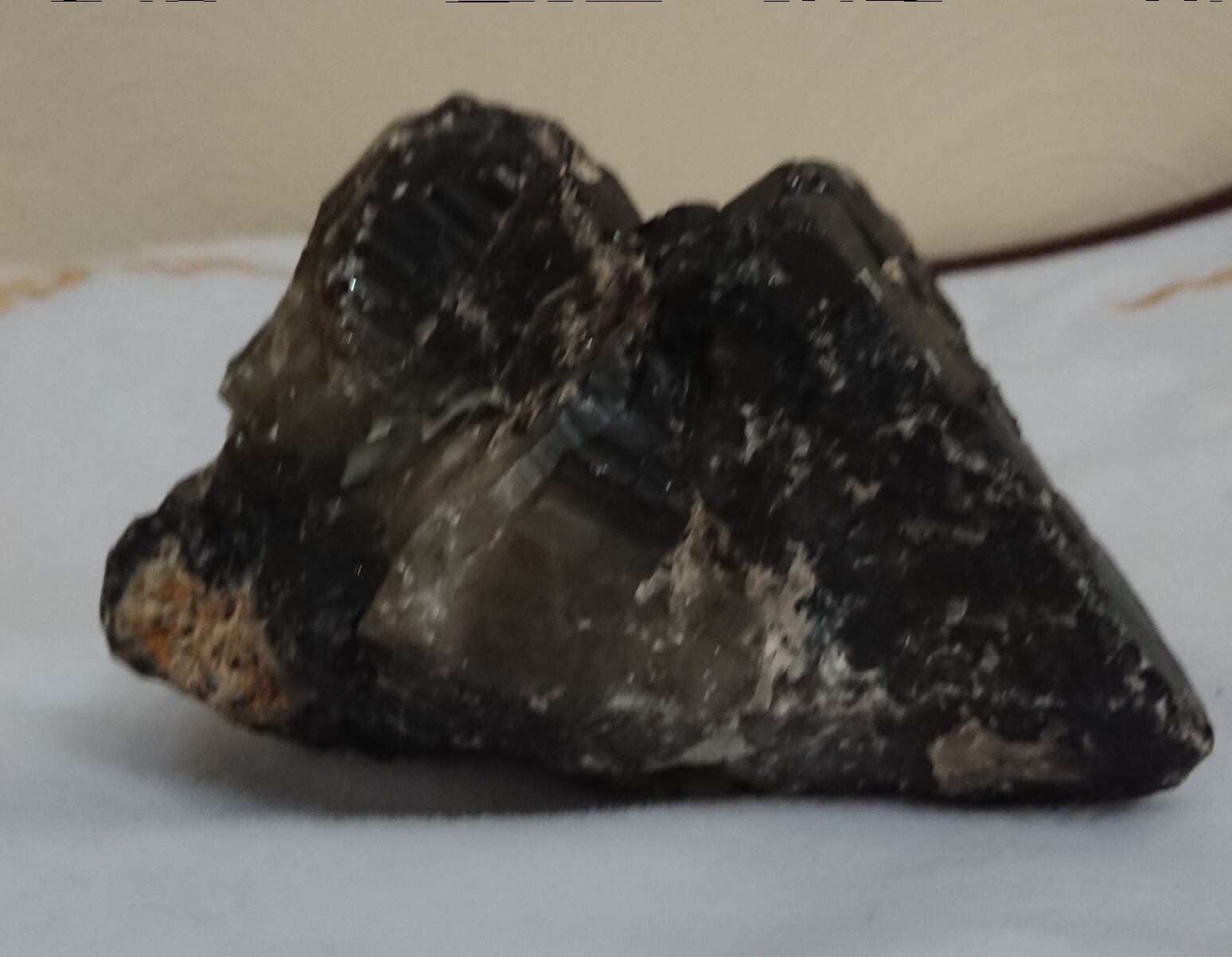 茶水晶と同じく自然の放射線の影響で暗色に変化した水晶。そのため水晶の透明度に関わらず、見た目で黒く見えるものは黒水晶(モリオン)、茶色のものは煙水晶と呼ばれるようです。黒水晶(モリオン)も水晶ですので強い光に当てると透けます。