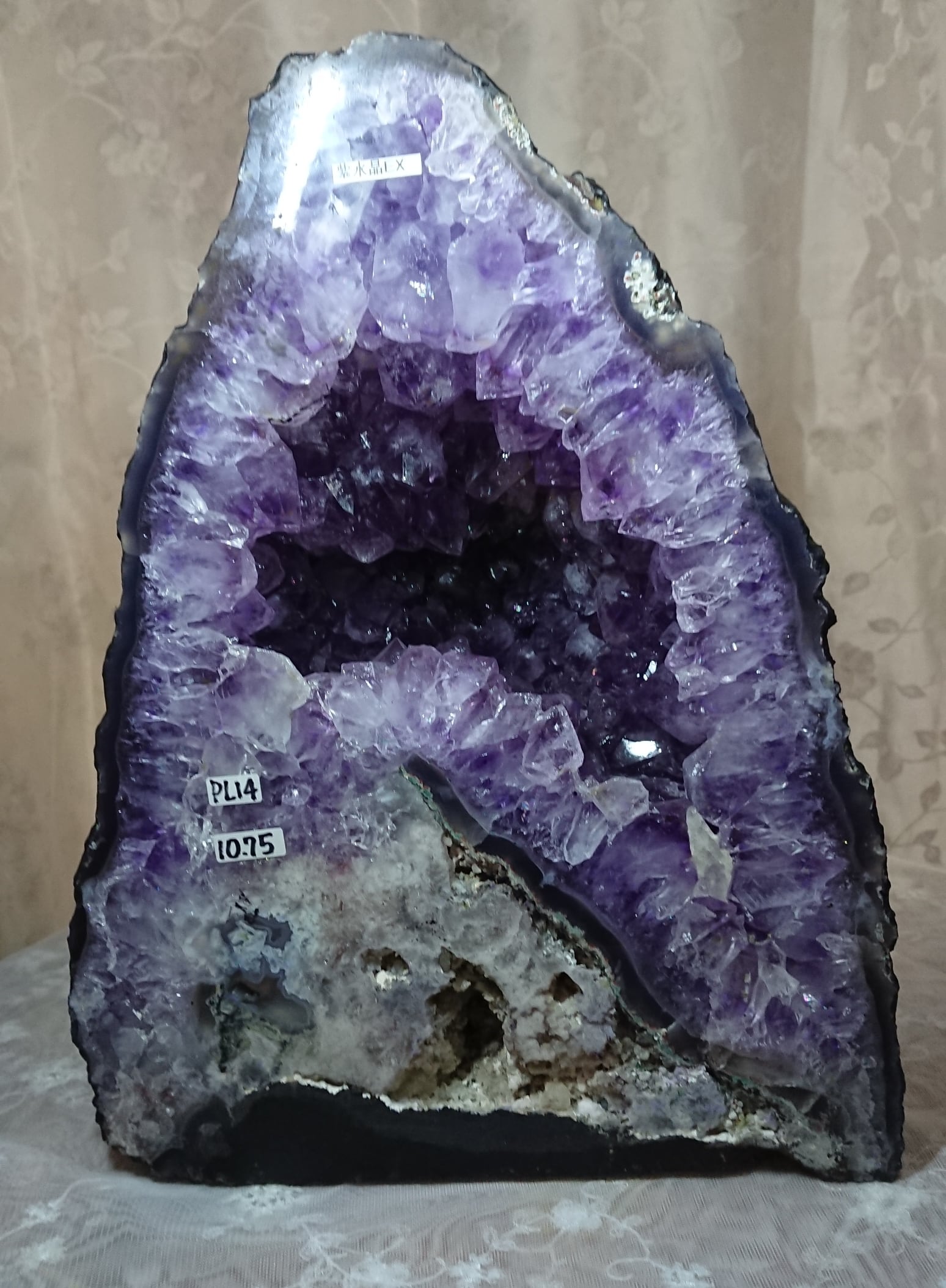 水晶は通常岩石の上に生成されますが、地層や岩の内側に洞窟状にできたものをアメジストドームといいます。アメジストの原石を半分に割り断面を美しく研磨すると、迫力と存在感、そしてエネルギーに満ちた置物に仕上がるのです。