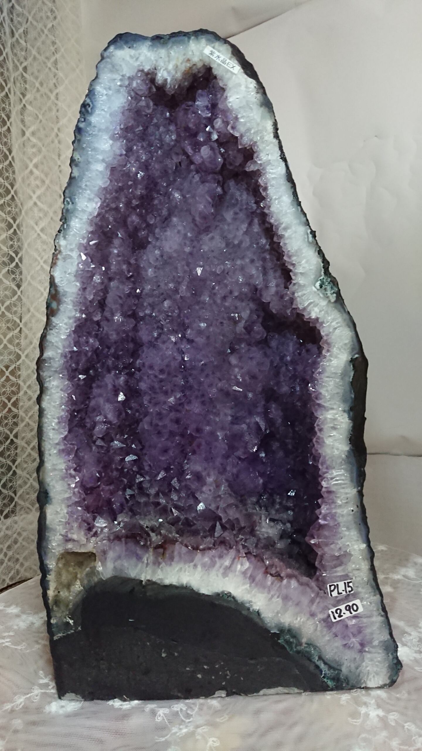 水晶は通常岩石の上に生成されますが、地層や岩の内側に洞窟状にできたものをアメジストドームといいます。アメジストの原石を半分に割り断面を美しく研磨すると、迫力と存在感、そしてエネルギーに満ちた置物に仕上がるのです。