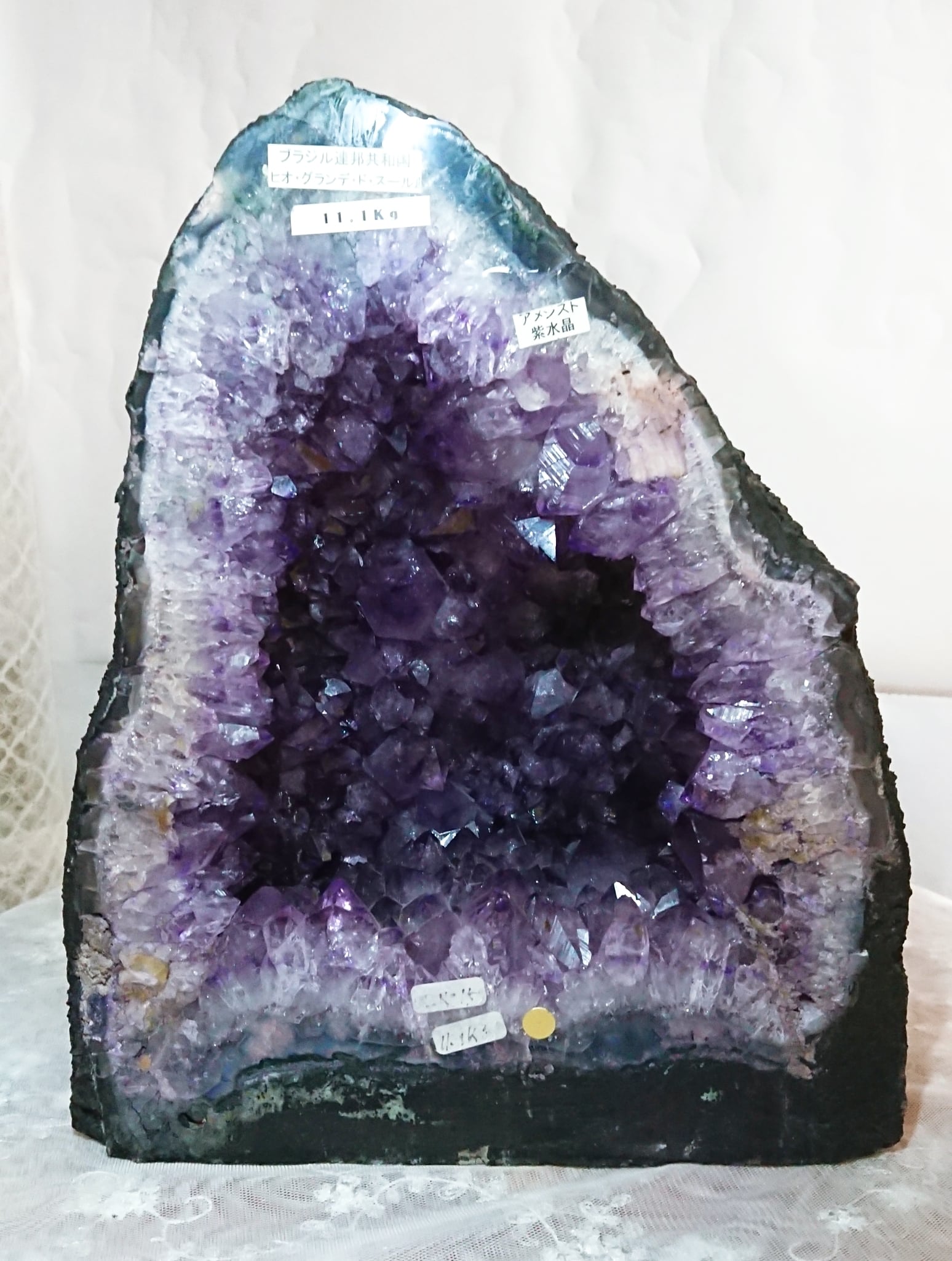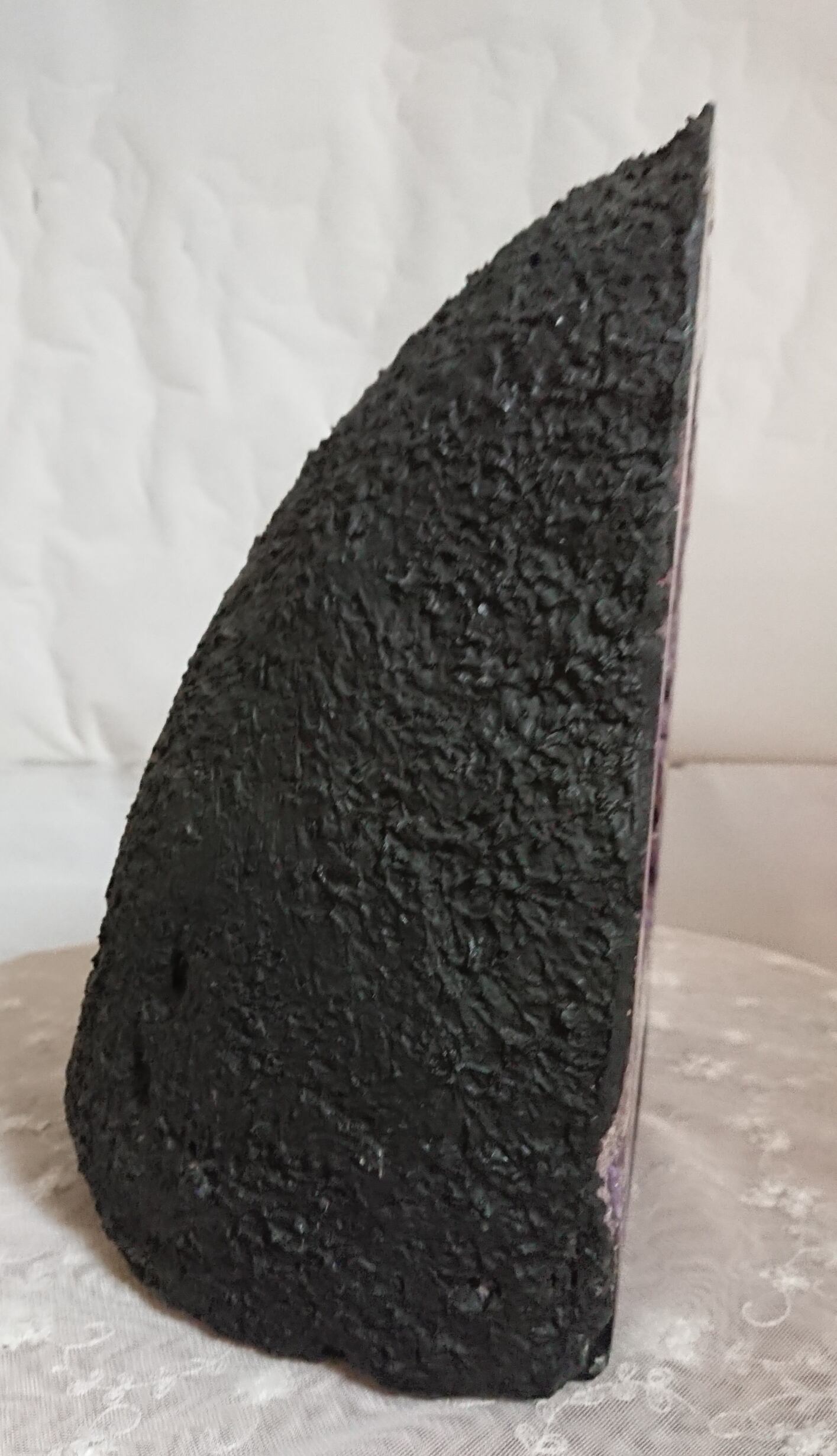 水晶は通常岩石の上に生成されますが、地層や岩の内側に洞窟状にできたものをアメジストドームといいます。アメジストの原石を半分に割り断面を美しく研磨すると、迫力と存在感、そしてエネルギーに満ちた置物に仕上がるのです。