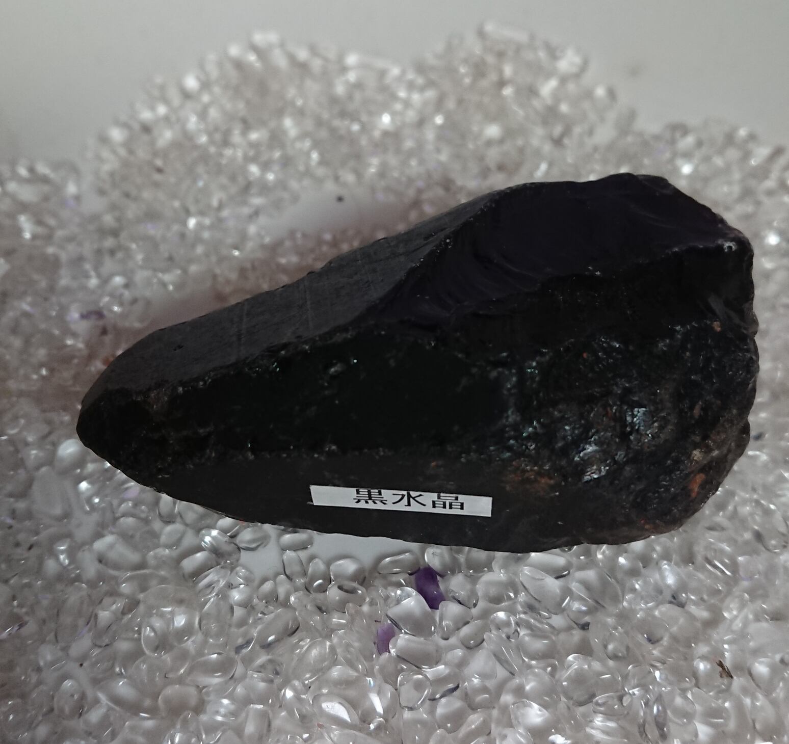 茶水晶と同じく自然の放射線の影響で暗色に変化した水晶。そのため水晶の透明度に関わらず、見た目で黒く見えるものは黒水晶(モリオン)、茶色のものは煙水晶と呼ばれるようです。黒水晶(モリオン)も水晶ですので強い光に当てると透けます。
