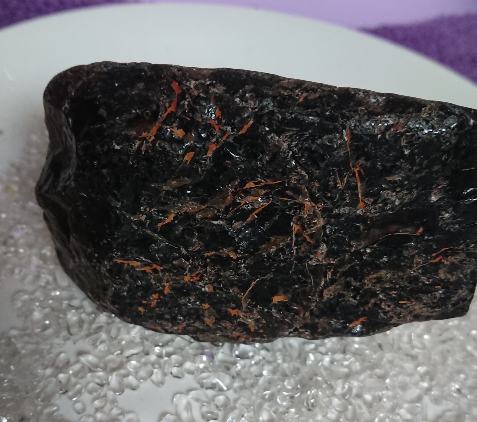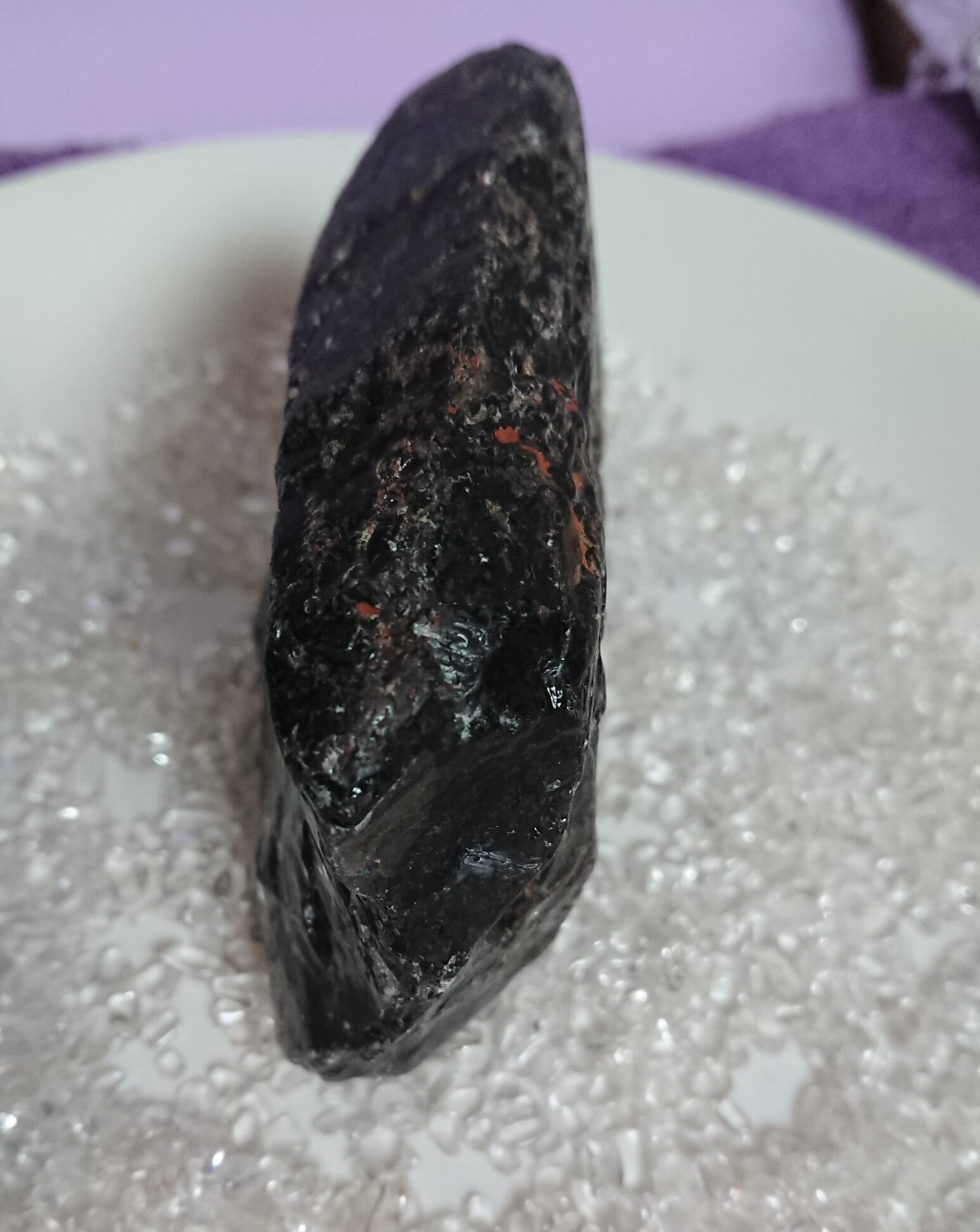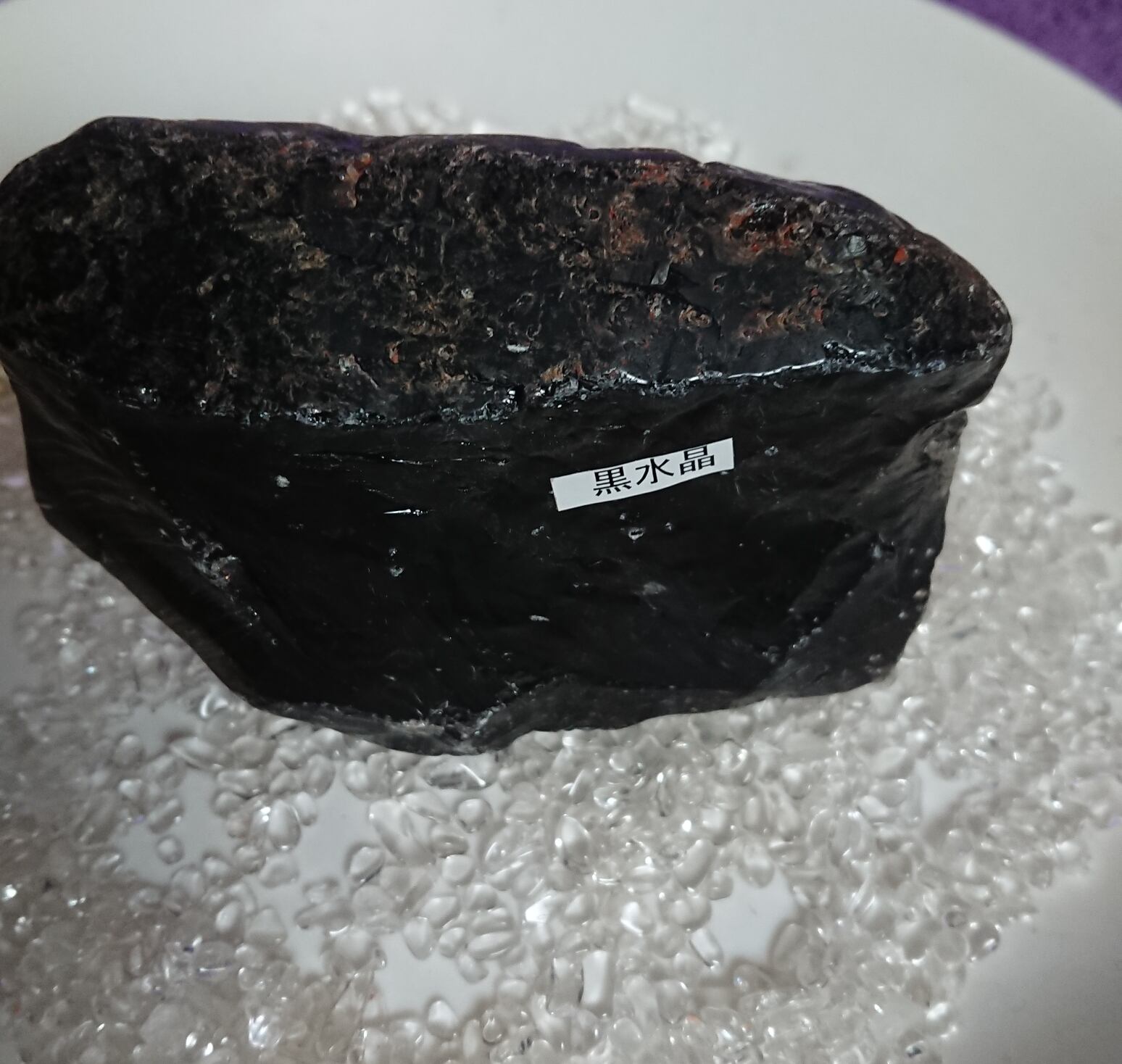 茶水晶と同じく自然の放射線の影響で暗色に変化した水晶。そのため水晶の透明度に関わらず、見た目で黒く見えるものは黒水晶(モリオン)、茶色のものは煙水晶と呼ばれるようです。黒水晶(モリオン)も水晶ですので強い光に当てると透けます。