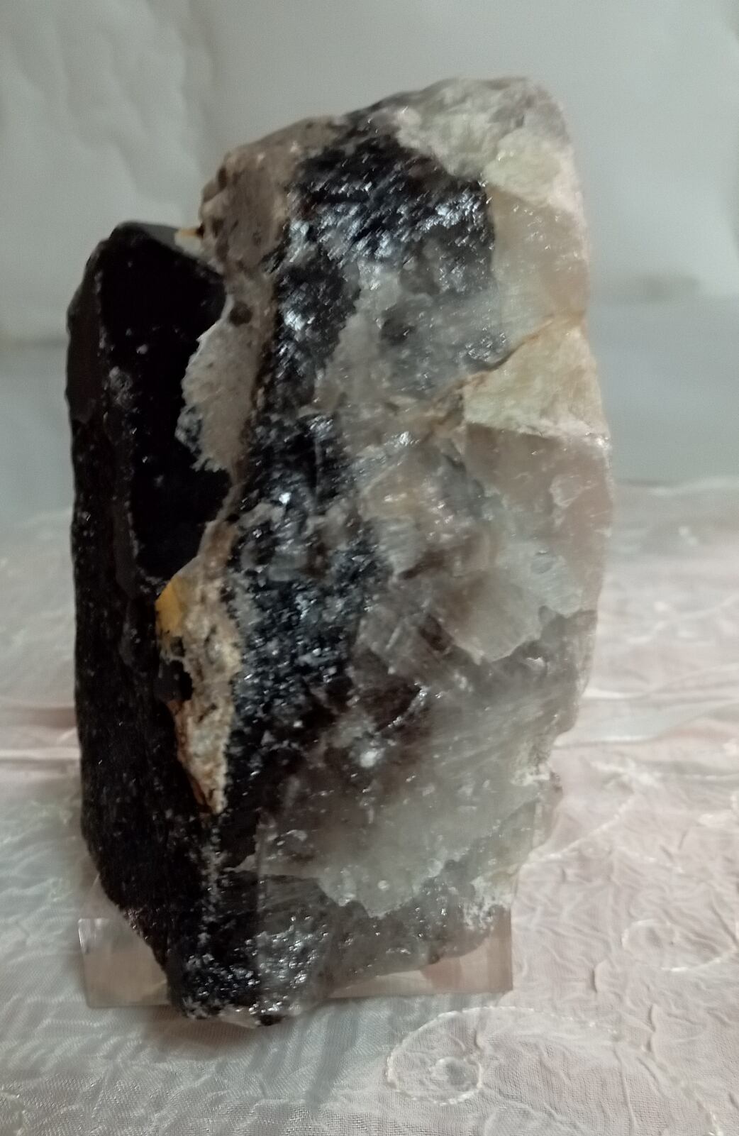 茶水晶と同じく自然の放射線の影響で暗色に変化した水晶。そのため水晶の透明度に関わらず、見た目で黒く見えるものは黒水晶(モリオン)、茶色のものは煙水晶と呼ばれるようです。黒水晶(モリオン)も水晶ですので強い光に当てると透けます。
