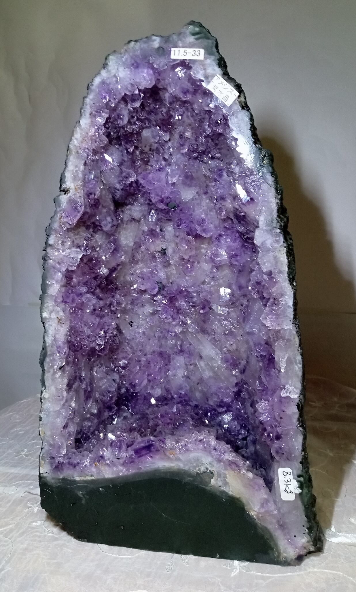 水晶は通常岩石の上に生成されますが、地層や岩の内側に洞窟状にできたものをアメジストドームといいます。アメジストの原石を半分に割り断面を美しく研磨すると、迫力と存在感、そしてエネルギーに満ちた置物に仕上がるのです。