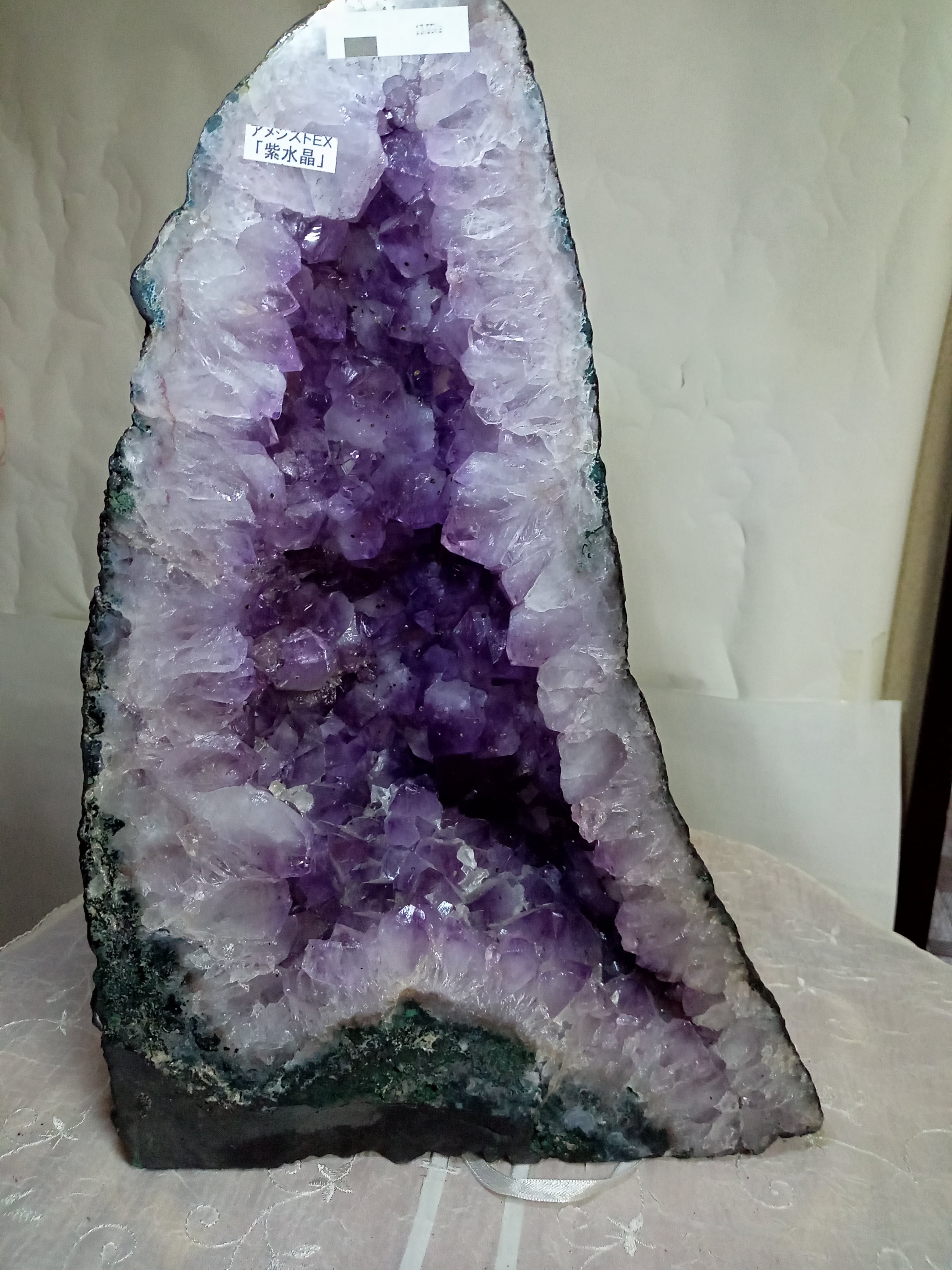 水晶は通常岩石の上に生成されますが、地層や岩の内側に洞窟状にできたものをアメジストドームといいます。アメジストの原石を半分に割り断面を美しく研磨すると、迫力と存在感、そしてエネルギーに満ちた置物に仕上がるのです。