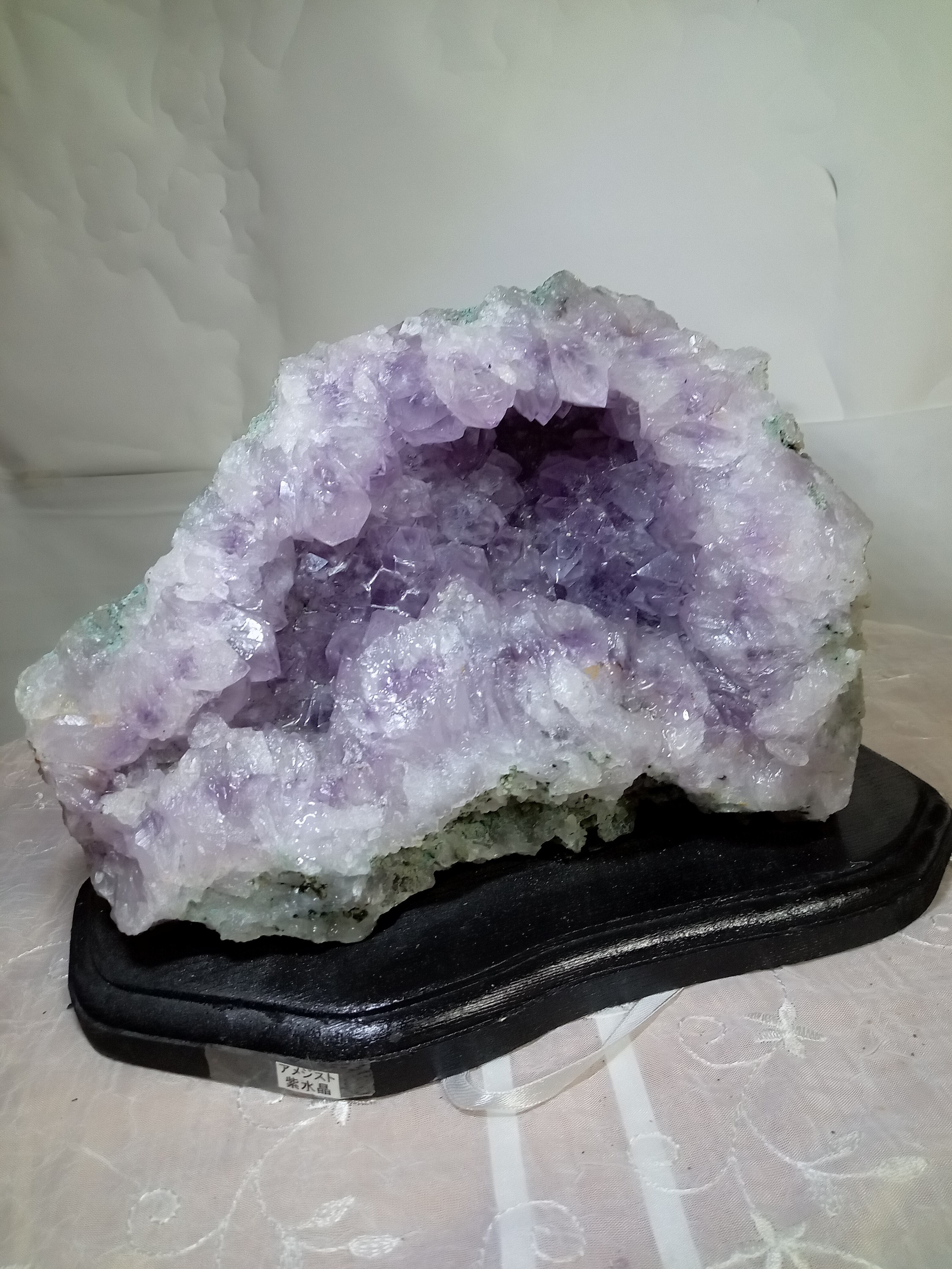水晶は通常岩石の上に生成されますが、地層や岩の内側に洞窟状にできたものをアメジストドームといいます。アメジストの原石を半分に割り断面を美しく研磨すると、迫力と存在感、そしてエネルギーに満ちた置物に仕上がるのです。