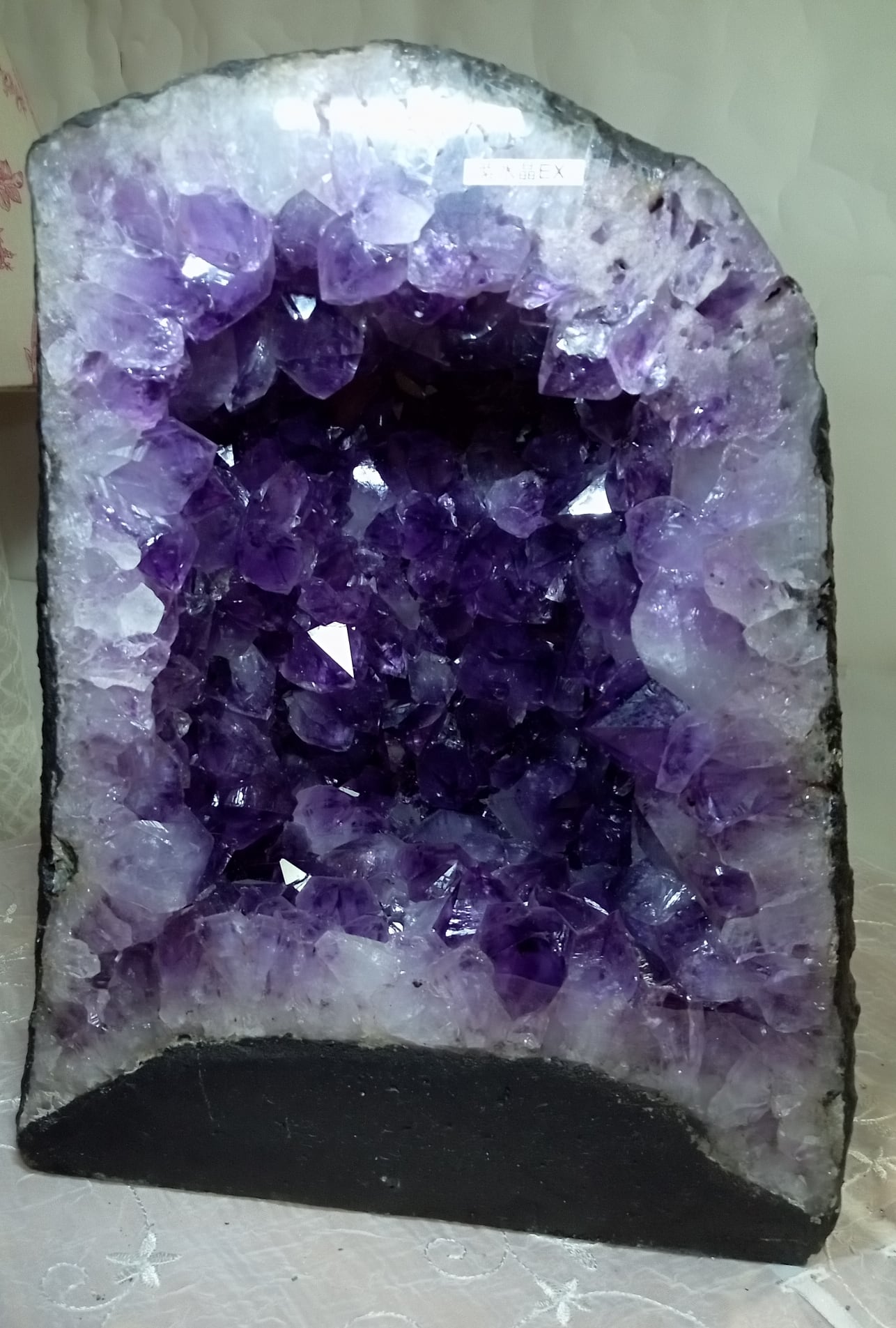 水晶は通常岩石の上に生成されますが、地層や岩の内側に洞窟状にできたものをアメジストドームといいます。アメジストの原石を半分に割り断面を美しく研磨すると、迫力と存在感、そしてエネルギーに満ちた置物に仕上がるのです。