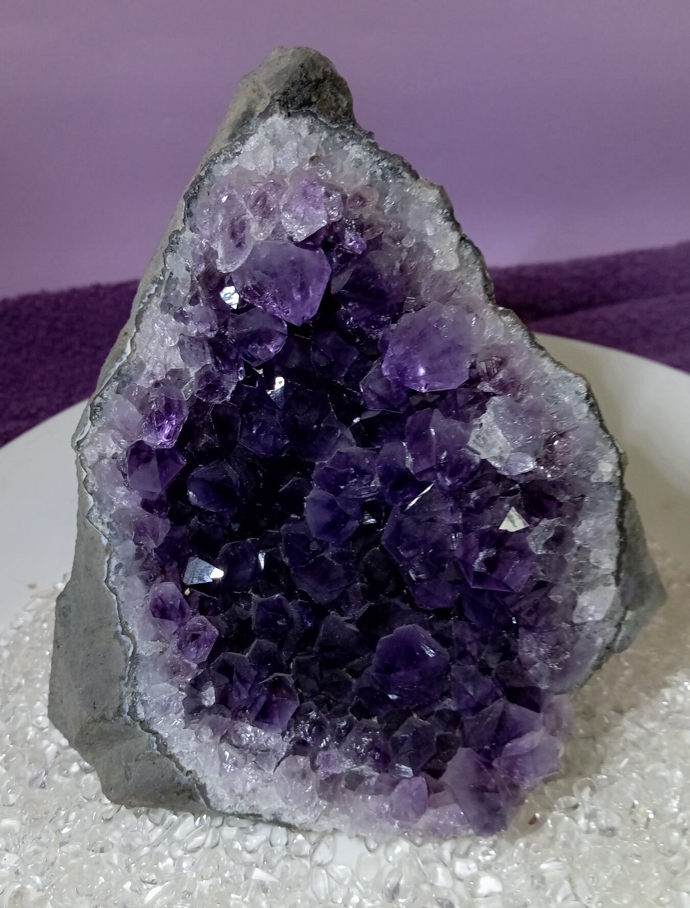 日本名の紫水晶の通り紫色を帯びた水晶で、その発色の要因は微量の鉄イオンが含まれているためとされています。 主に晶洞石の内部の取り残された火山ガスの泡によってできた岩の空洞内に形成されます。