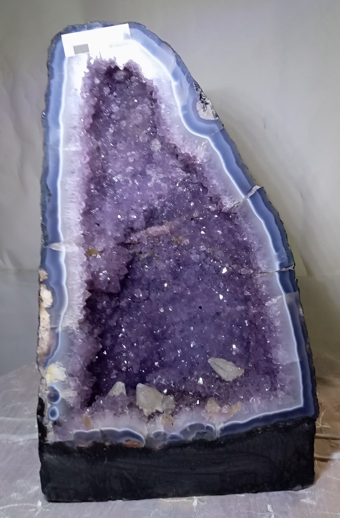 水晶は通常岩石の上に生成されますが、地層や岩の内側に洞窟状にできたものをアメジストドームといいます。アメジストの原石を半分に割り断面を美しく研磨すると、迫力と存在感、そしてエネルギーに満ちた置物に仕上がるのです。