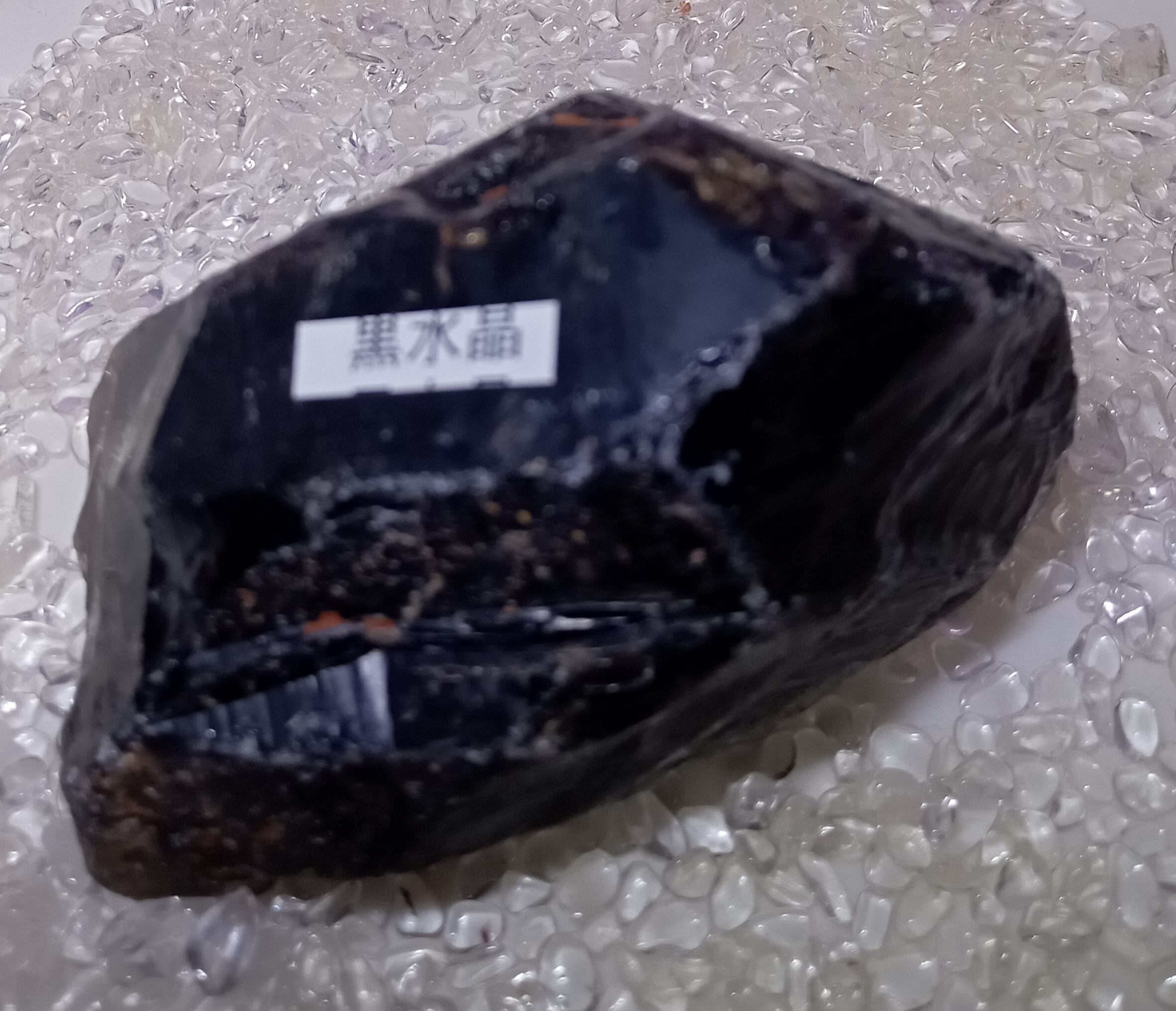 茶水晶と同じく自然の放射線の影響で暗色に変化した水晶。そのため水晶の透明度に関わらず、見た目で黒く見えるものは黒水晶(モリオン)、茶色のものは煙水晶と呼ばれるようです。黒水晶(モリオン)も水晶ですので強い光に当てると透けます。