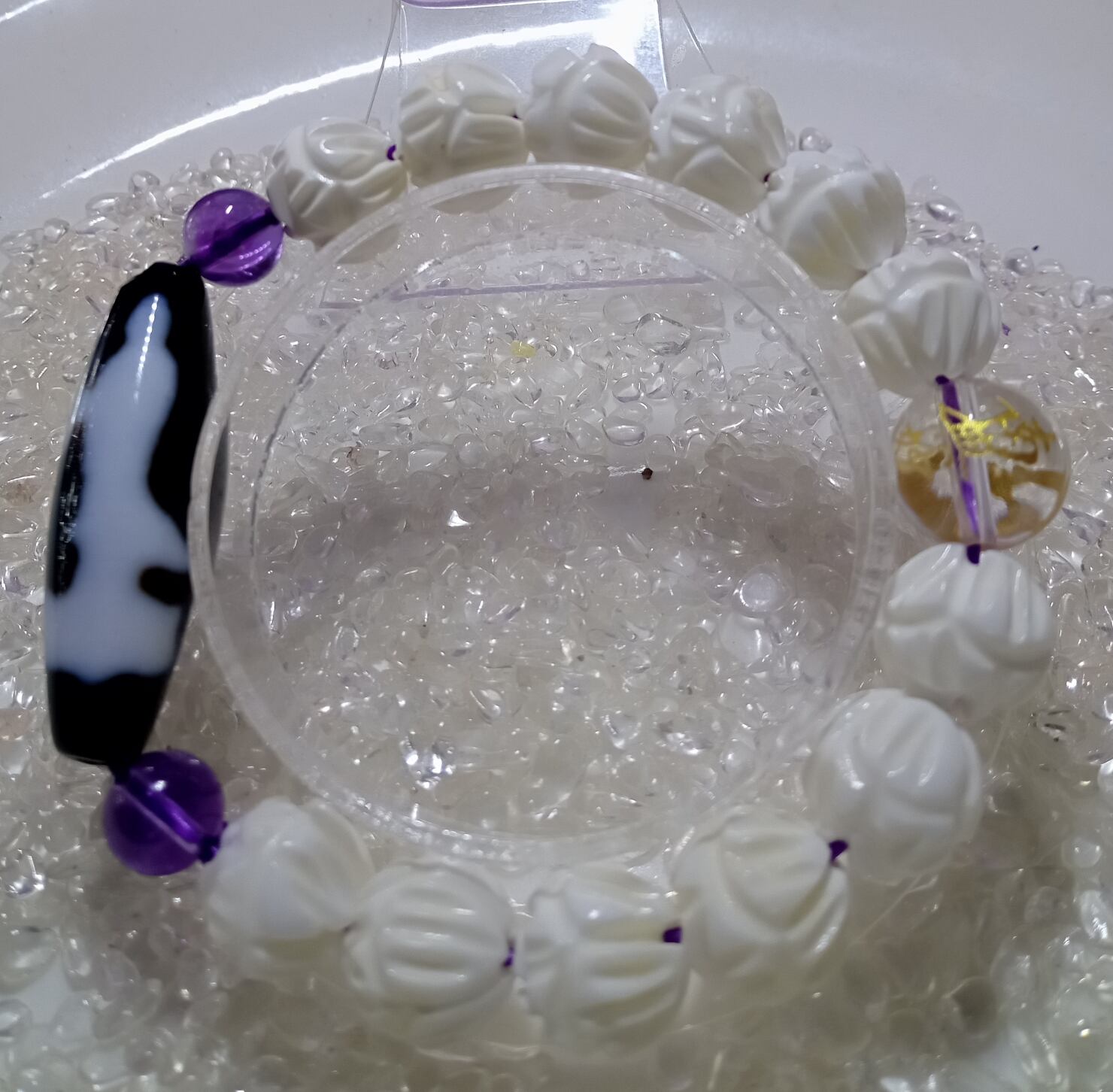 天珠は、家運繁栄と事業成功と病魔退散に力を発揮する神聖な石として、紀元前から脈々と受け継がれてきました。 天珠のデザインは、それ自体が象徴的な意義や功徳利益を持つもので、今日世界各国で「神の石」として祟められ、また、危険や悪い出来事などのネガティブなエネルギーから守る「身代わり石」とも呼ばれています。 観自在菩薩(観音様)の力ですべてうまくいき、丸く収まるとされる天珠です。観音菩薩のお姿が白く浮かび上がった、裏面は半透明光環。仏光普照、金運招来、安心立命、開運守護といわれています。心が平和になると伝えられてます。