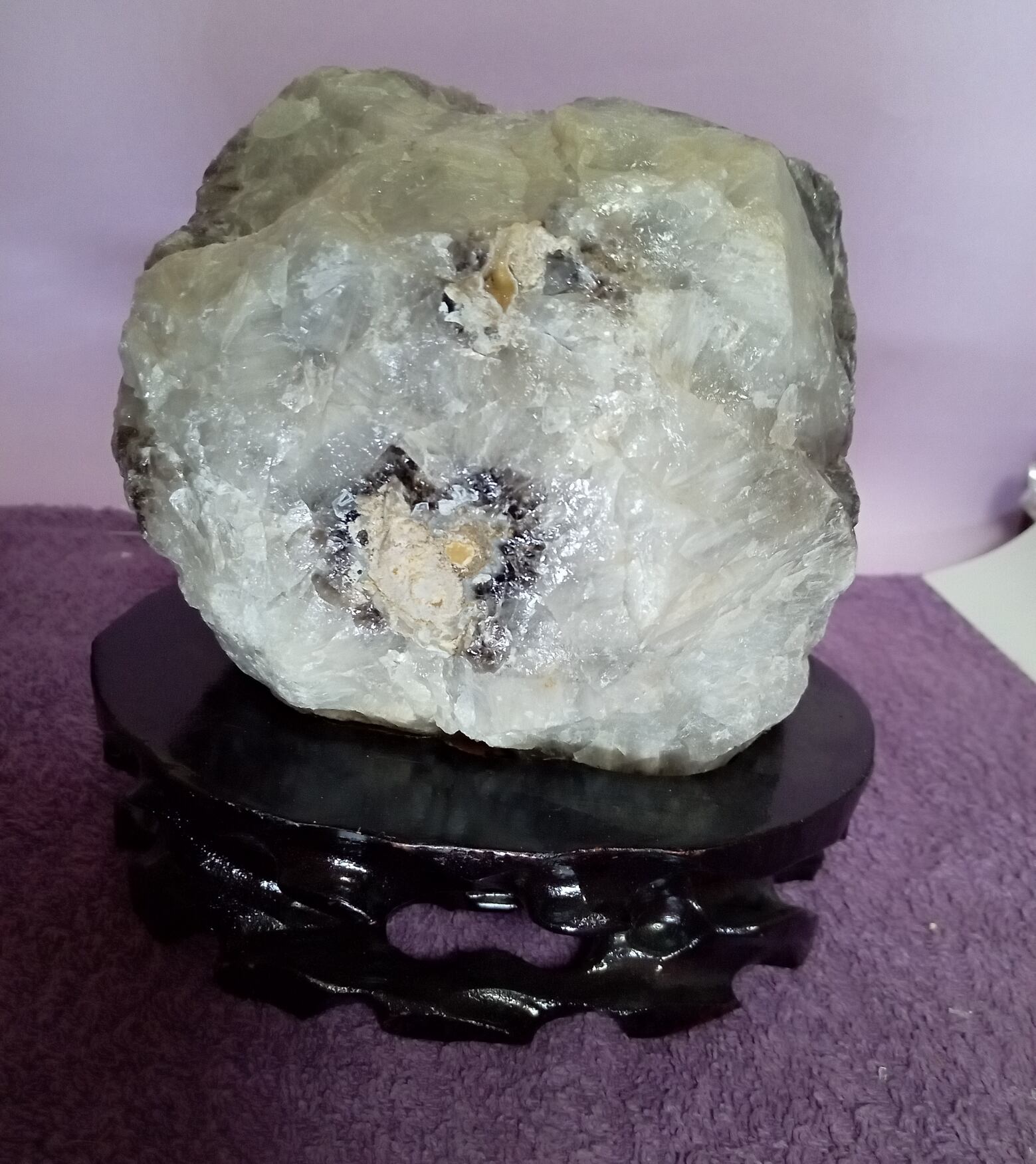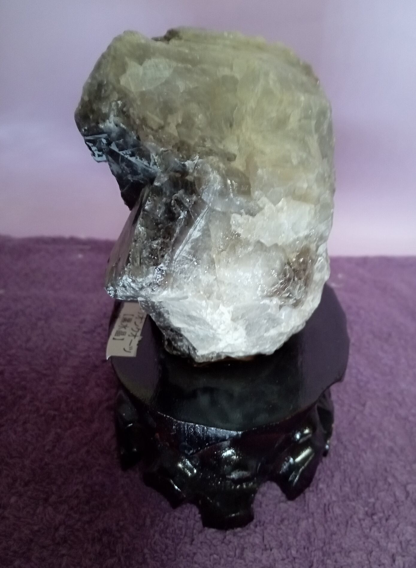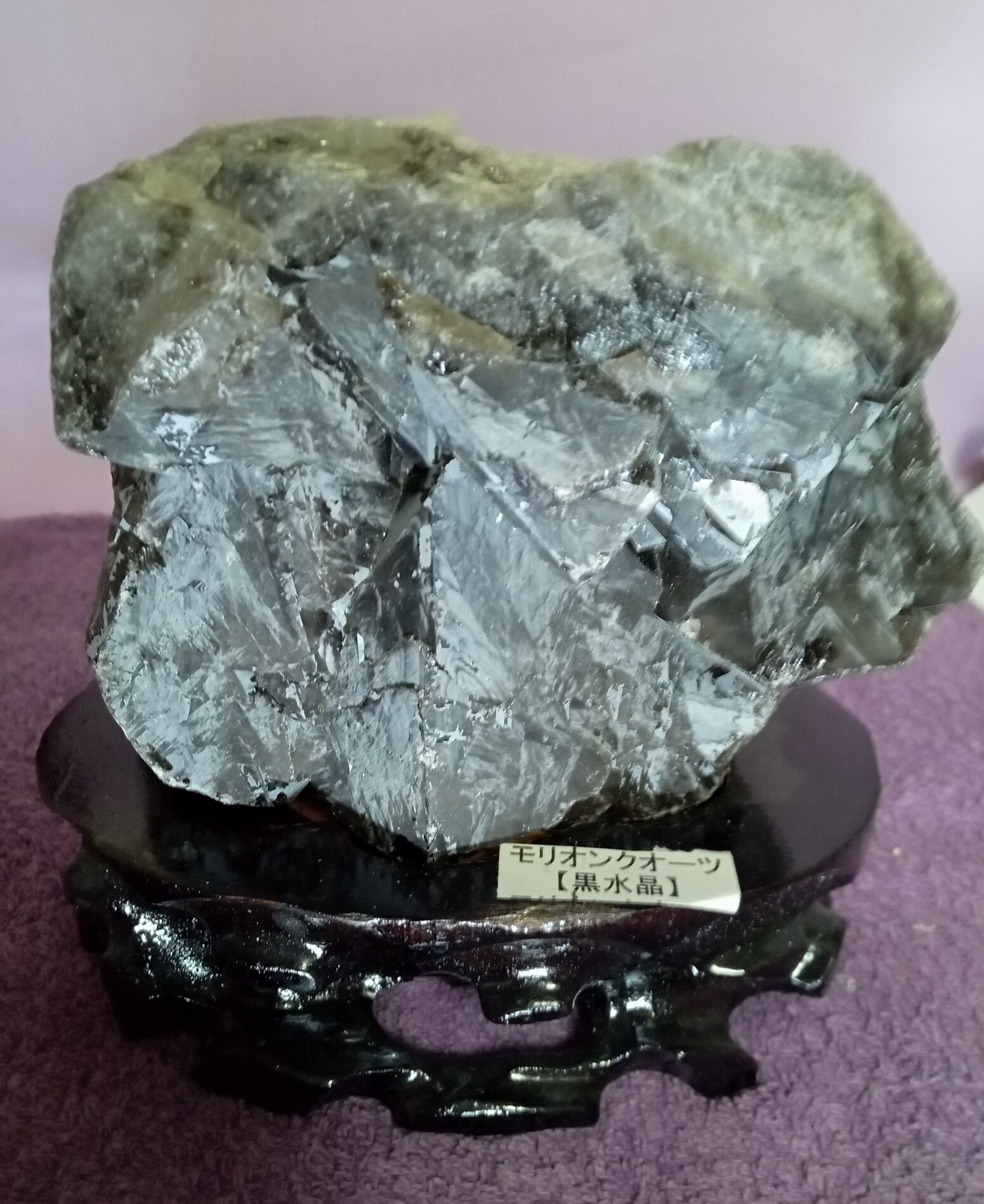 茶水晶と同じく自然の放射線の影響で暗色に変化した水晶。そのため水晶の透明度に関わらず、見た目で黒く見えるものは黒水晶(モリオン)、茶色のものは煙水晶と呼ばれるようです。黒水晶(モリオン)も水晶ですので強い光に当てると透けます。