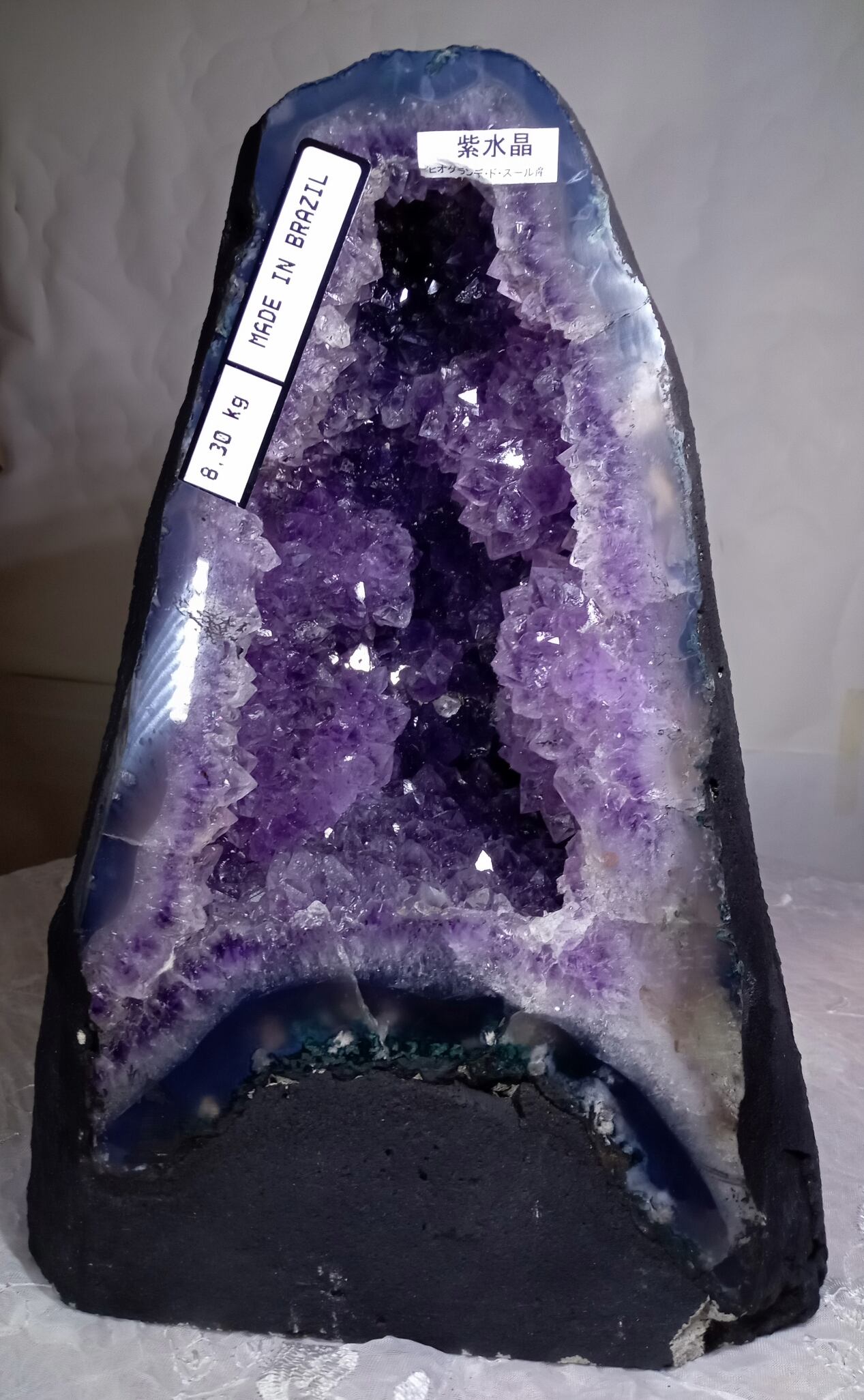 水晶は通常岩石の上に生成されますが、地層や岩の内側に洞窟状にできたものをアメジストドームといいます。アメジストの原石を半分に割り断面を美しく研磨すると、迫力と存在感、そしてエネルギーに満ちた置物に仕上がるのです。