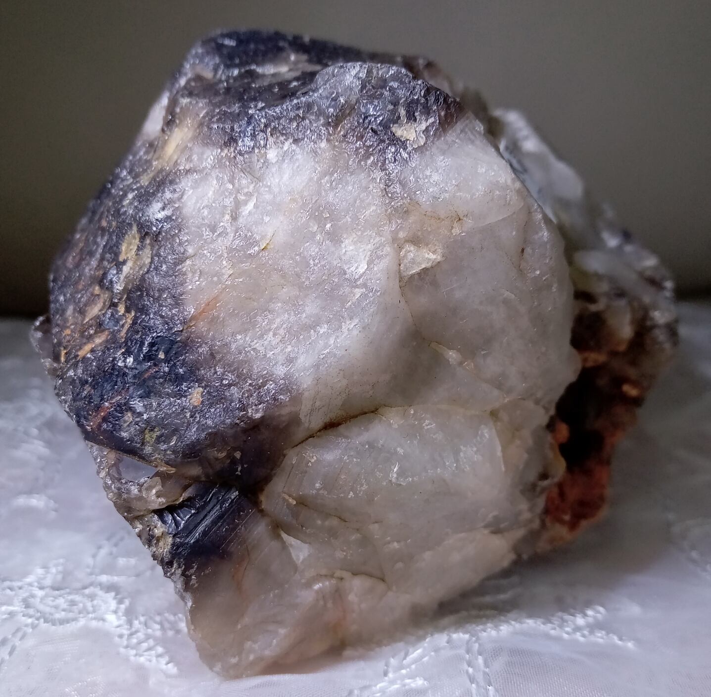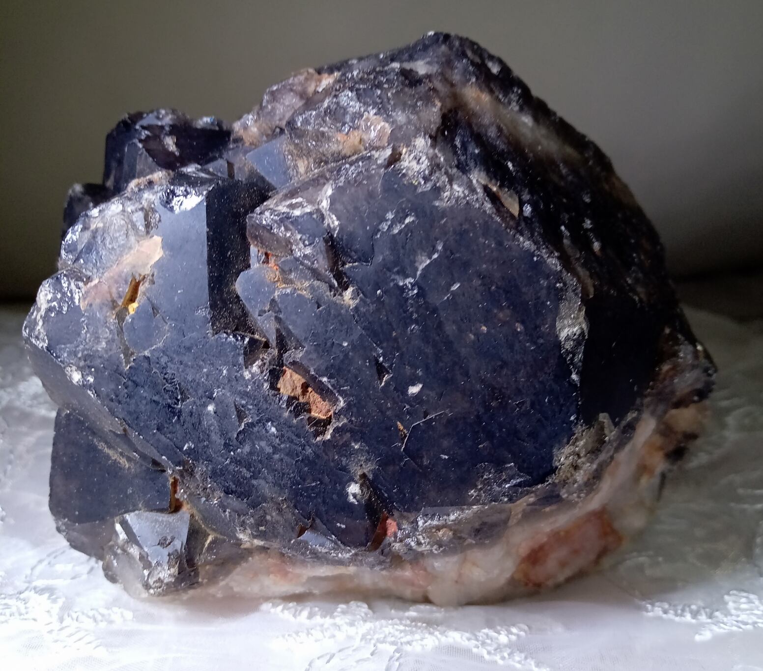 茶水晶と同じく自然の放射線の影響で暗色に変化した水晶。そのため水晶の透明度に関わらず、見た目で黒く見えるものは黒水晶(モリオン)、茶色のものは煙水晶と呼ばれるようです。黒水晶(モリオン)も水晶ですので強い光に当てると透けます。