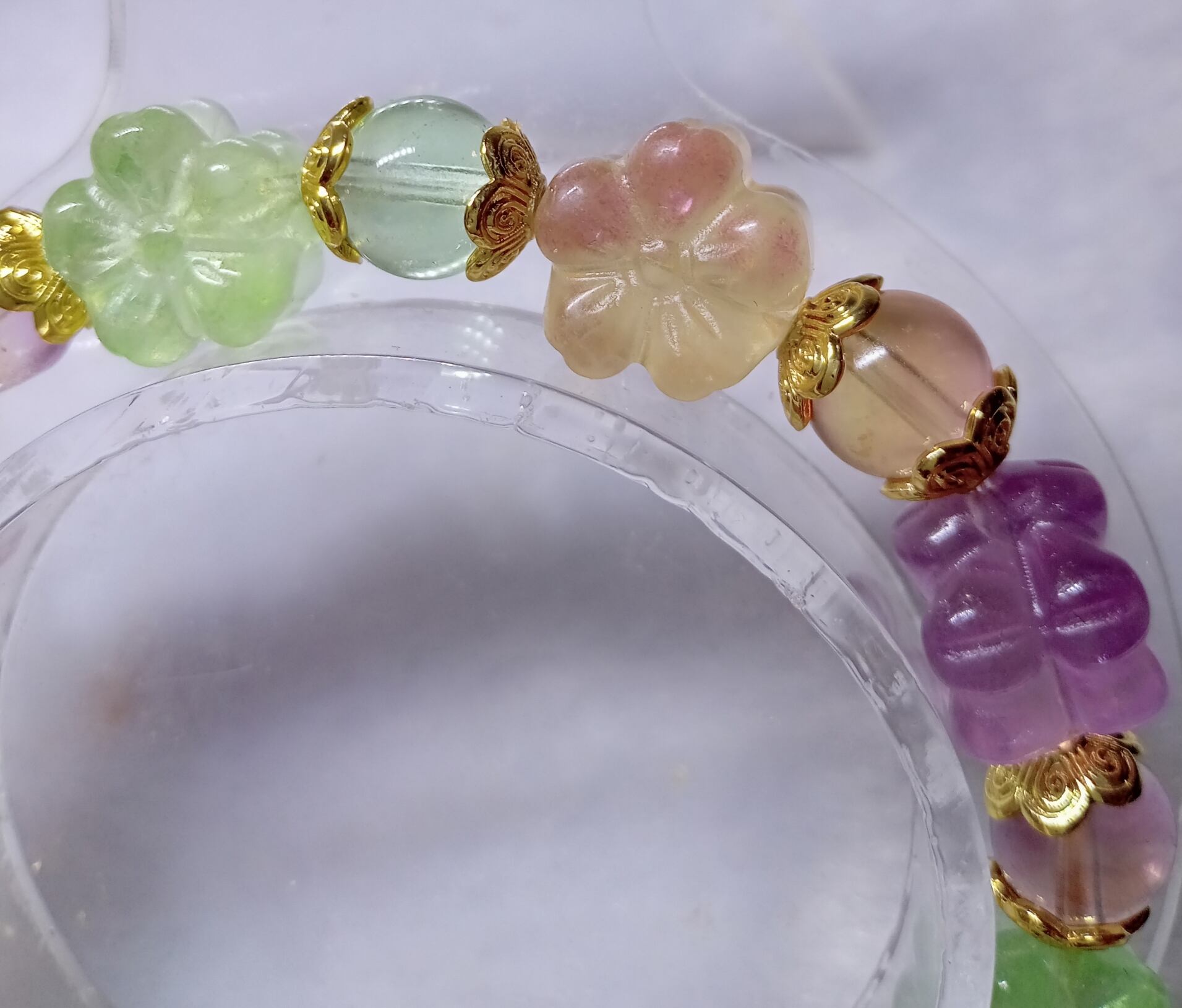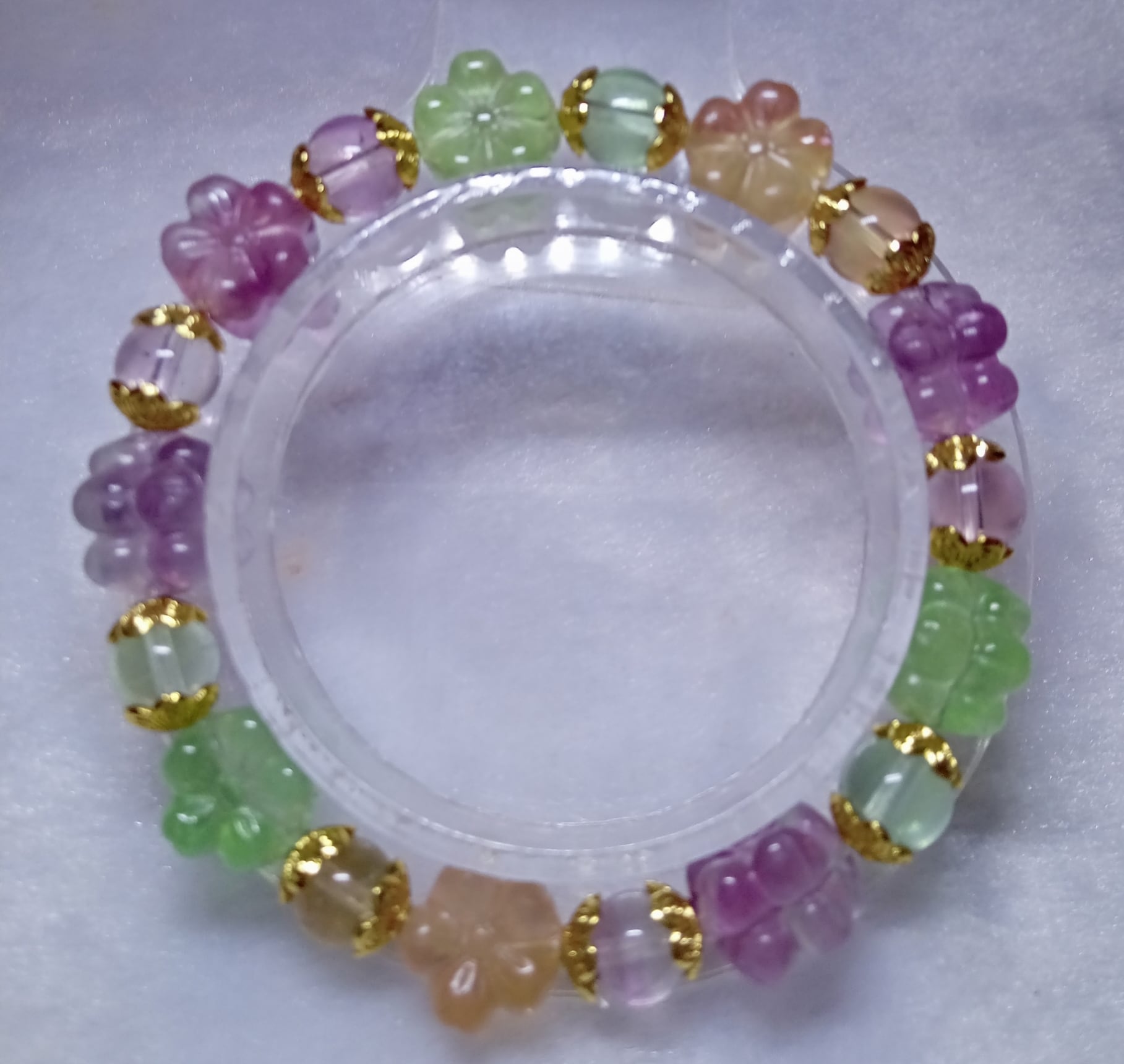 フローライトは色別にエネルギー的特性が多少異なります。あくまでも傾向としてですが、パープル系は明晰性や感受性を高める傾向、グリーン系は癒し的に働き、グラデーションカラーのものは、想像力を高める傾向が強いようです。
