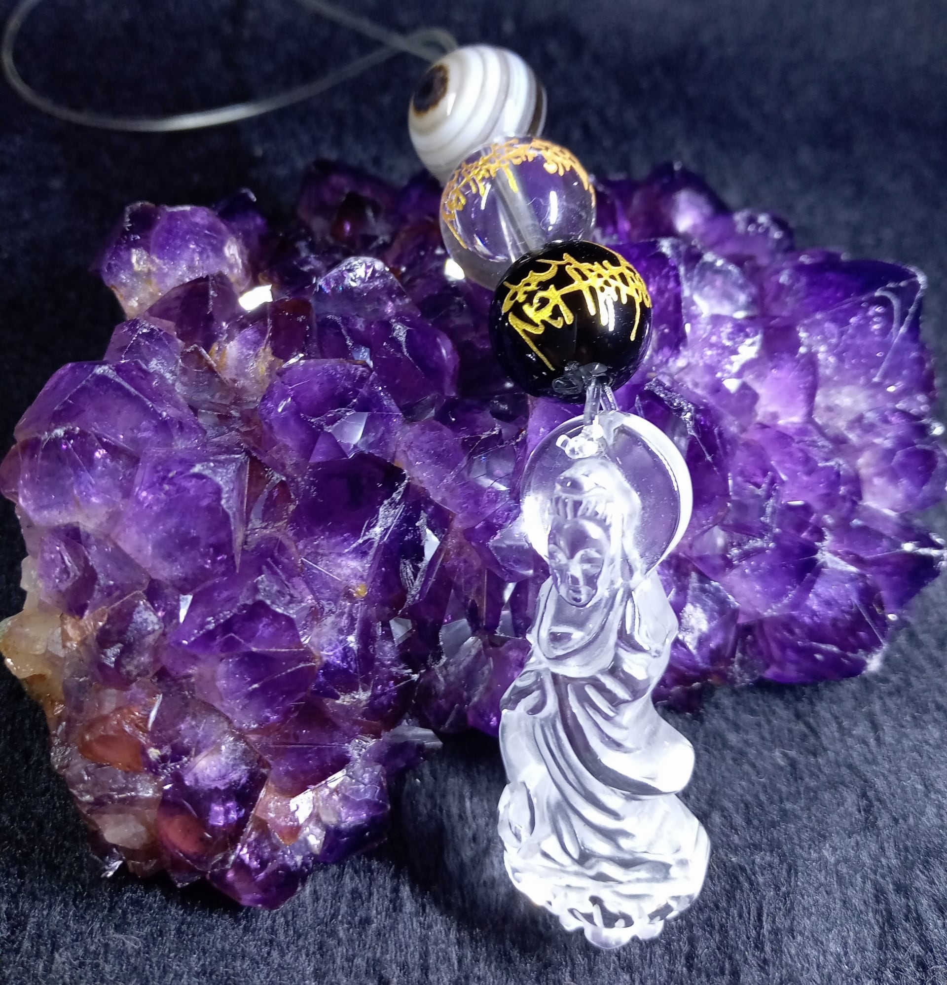 アメジストクラスターの上に観音様のストラップを置いて、枕の上や脇に置いて休むと受けたものを吸ってもらい安眠できやすくなります。